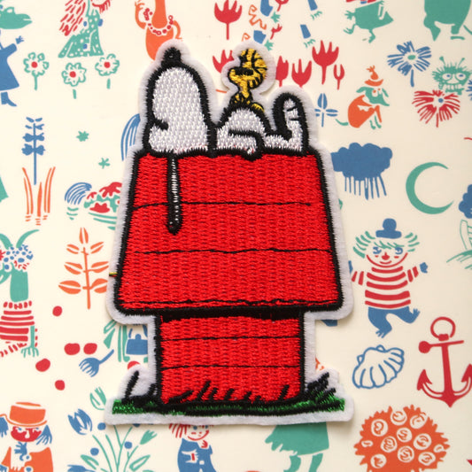 Snoopy Embroidery Patch // Snoopy from the Peanuts comics sleeping on his dog house embroidered iron-on patch badge appliqué (2 Designs)