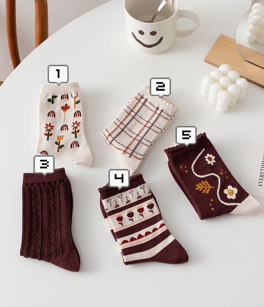Chocolate Brown Cottagecore Crew Socks (5 Designs)