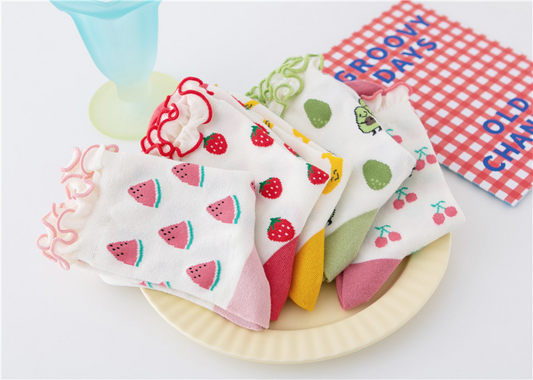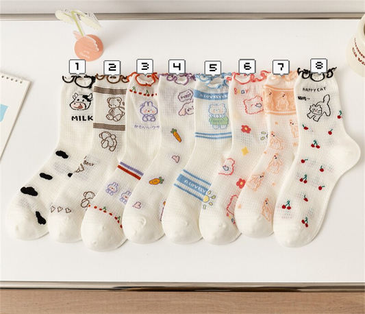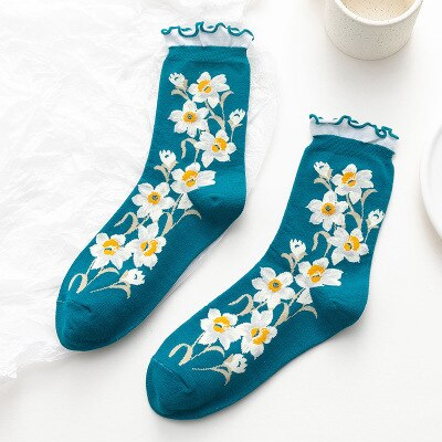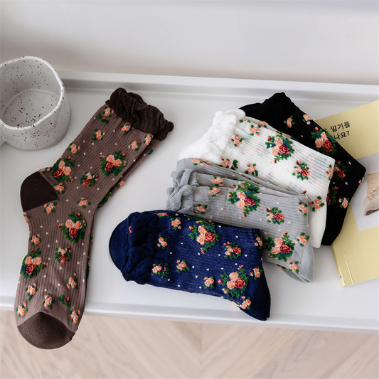 Ruffled Flower Embroidery Crew Socks (5 Colours)