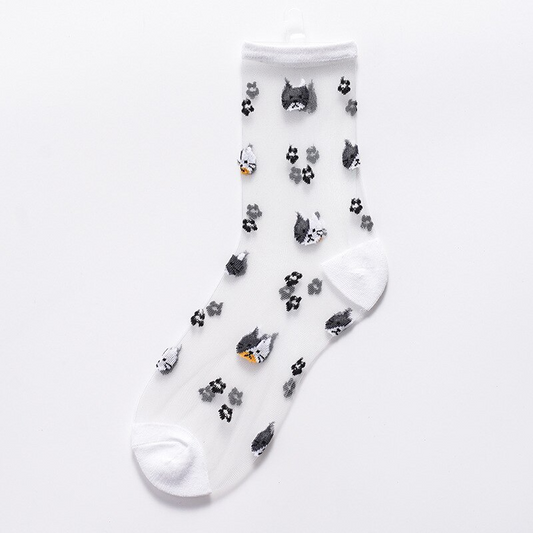 Sheer Embroidered Cat Face Pattern Crew Socks (2 Colours)