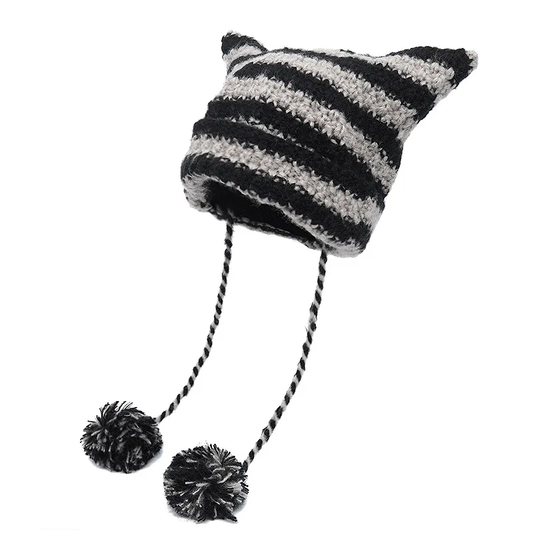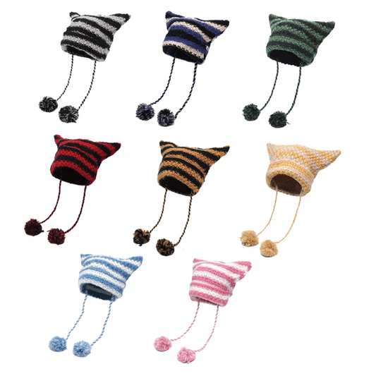 Crochet Striped Kitty Ear Beanie Hat with Pom Poms (8 Colours)