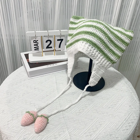 Crochet Striped Kitty Ear Beanie Hat with Strawberry PomPoms (3 Colours)