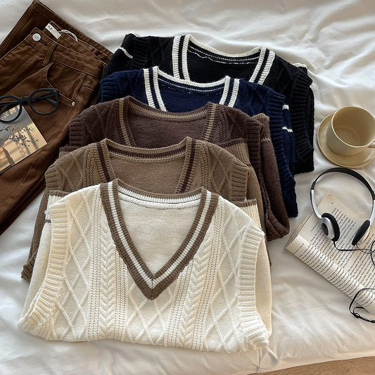 Dark Academia Contrast Stripe Cable Knit Sweater Vest (5 colours)