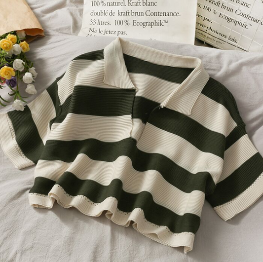 Pointed Collar Striped Knit Polo Shirt (5 Colours)
