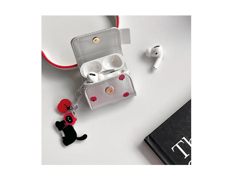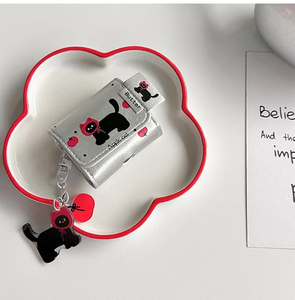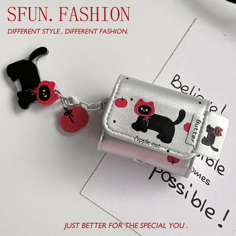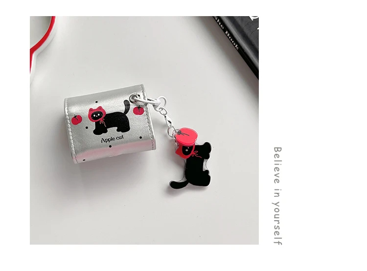 Keep your AirPods safe and stylish with this adorable silver charger case cover! Featuring a cute and quirky design of a little black cat wearing an apple hat, this cover is sure to bring a smile to your face every time you use it. Plus, the detachable clip with acrylic cat and apple charms adds an extra touch of personality to your tech. With a convenient foldover wallet style closure, this cover not only looks great, but also keeps your AirPods protected when on the go. Get the purr-fect balance of fashion and functionality with this charming cat and apple-themed charger case cover.