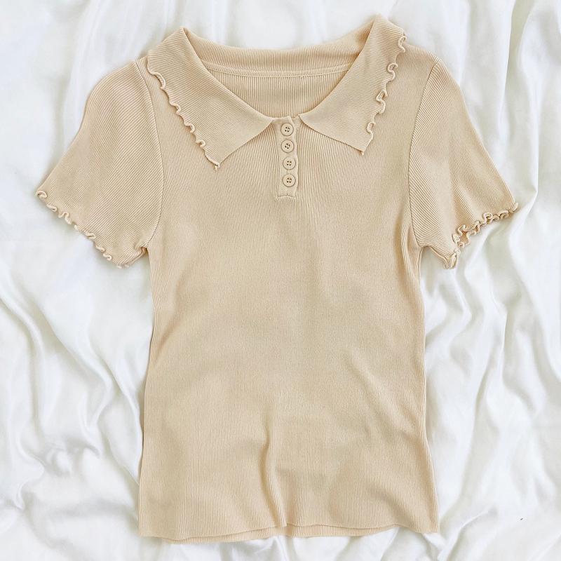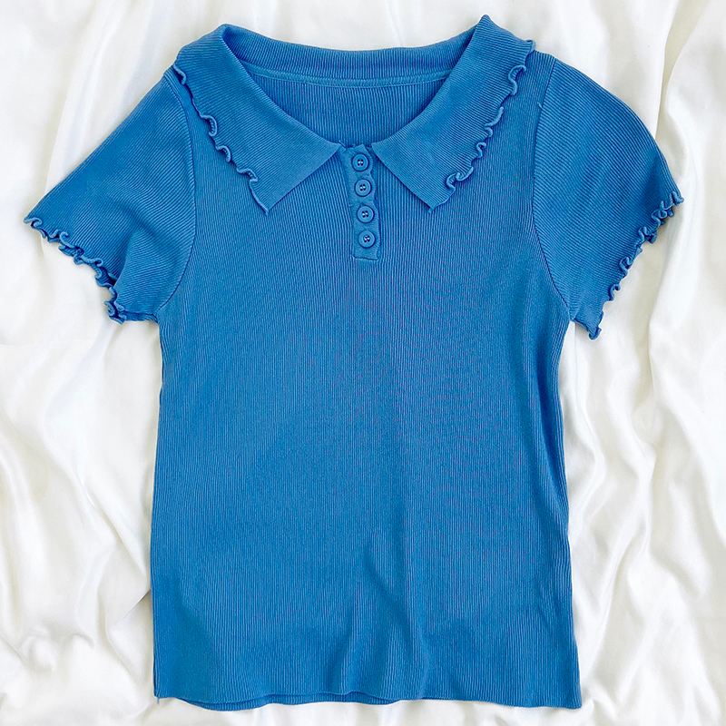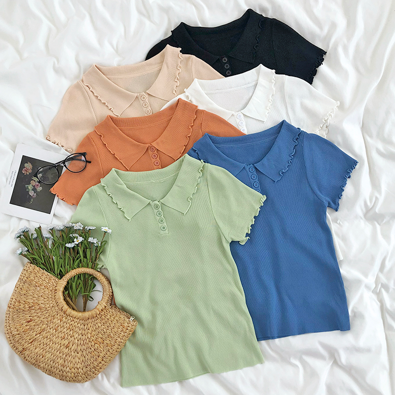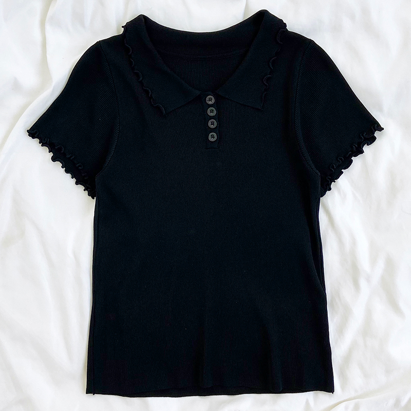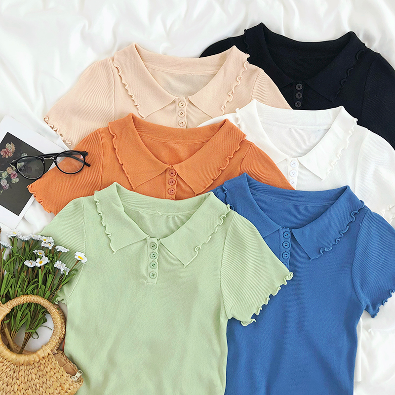 Vintage style fitted collared short-sleeved knit top with buttoned collar and frill edge detail! Available in six different colours.