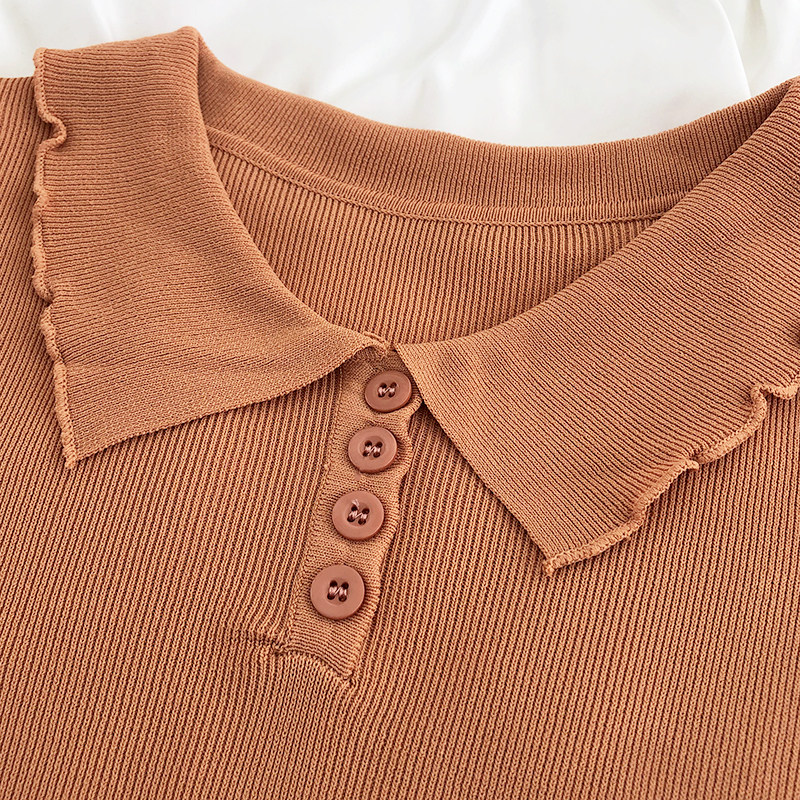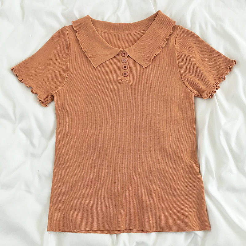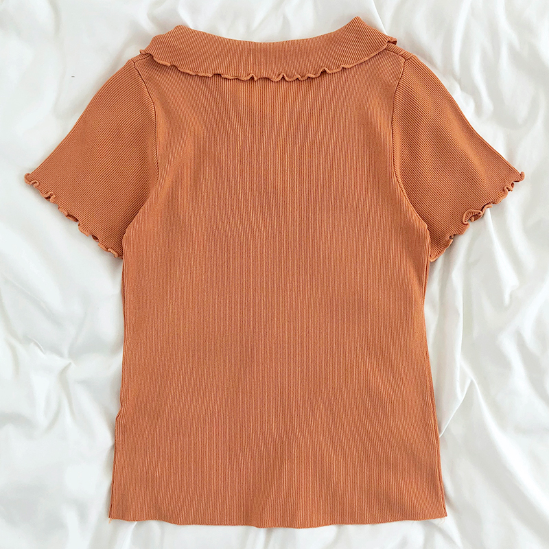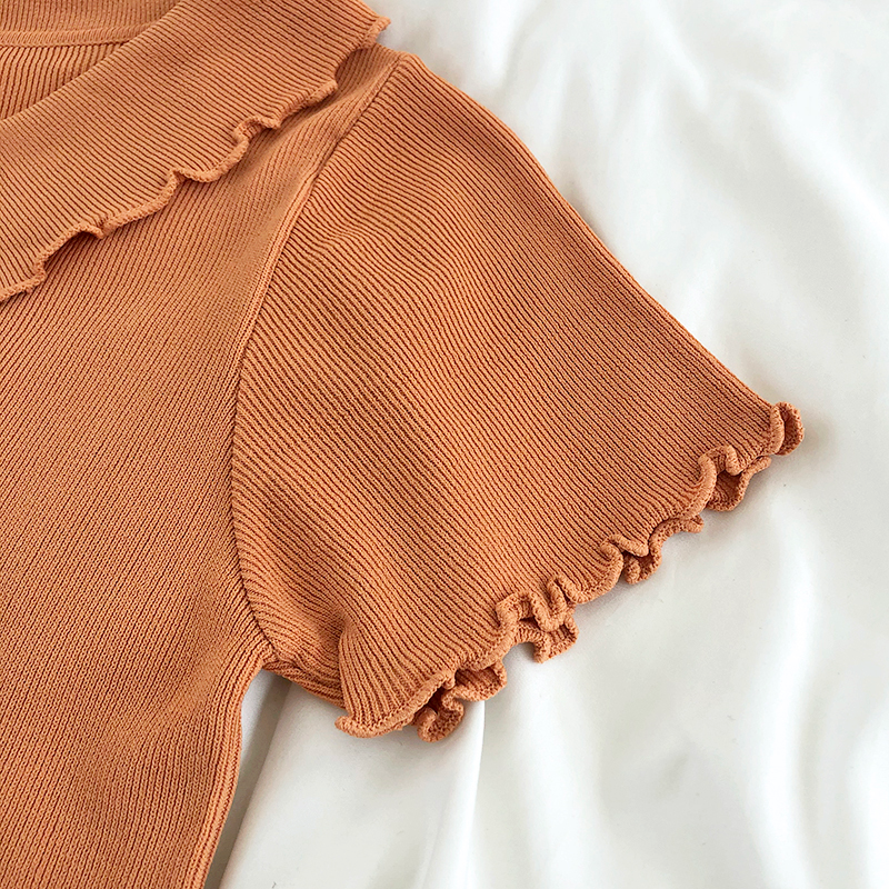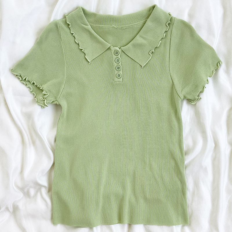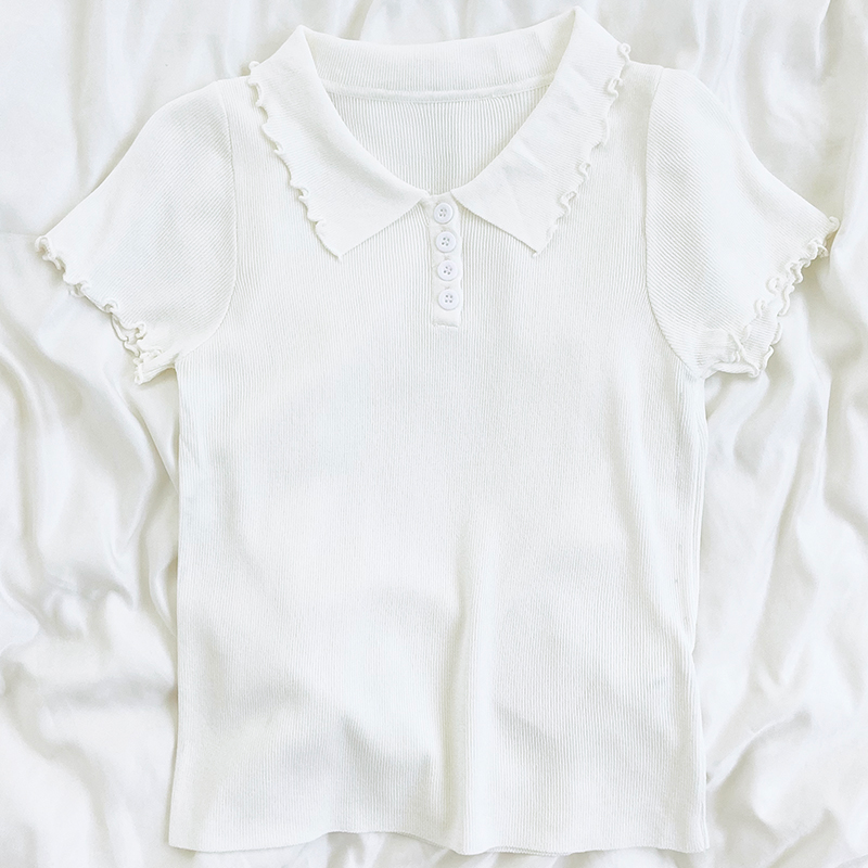 Vintage style fitted collared short-sleeved knit top with buttoned collar and frill edge detail! Available in six different colours.