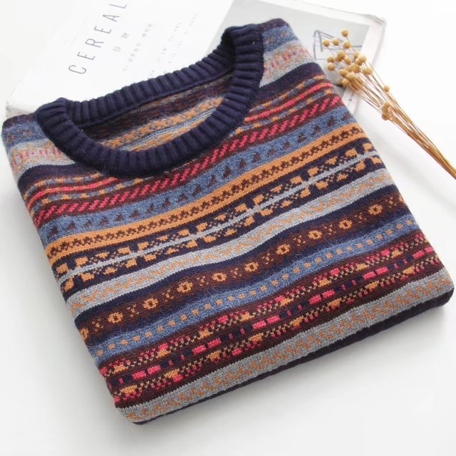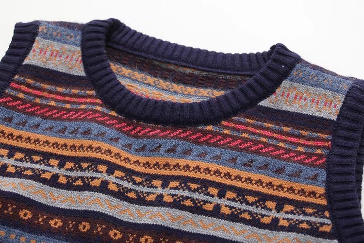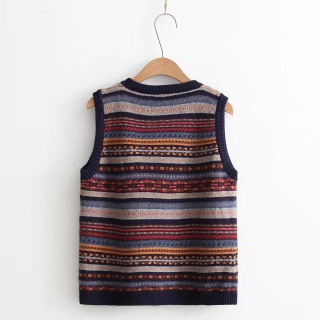 Knitted sleeveless sweater vest with multipattern and stripe detailing.