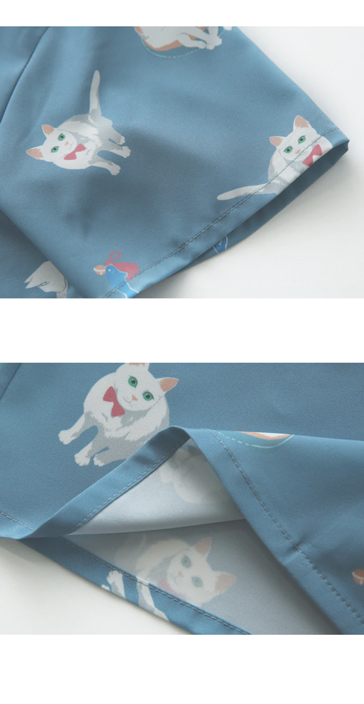Blue short-sleeved collared button-up blouse with allover cat illustration pattern