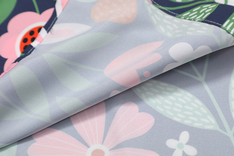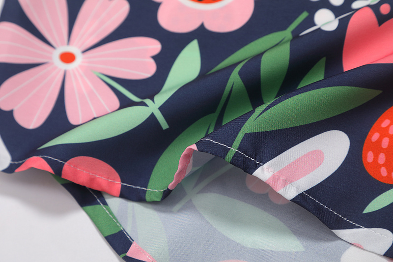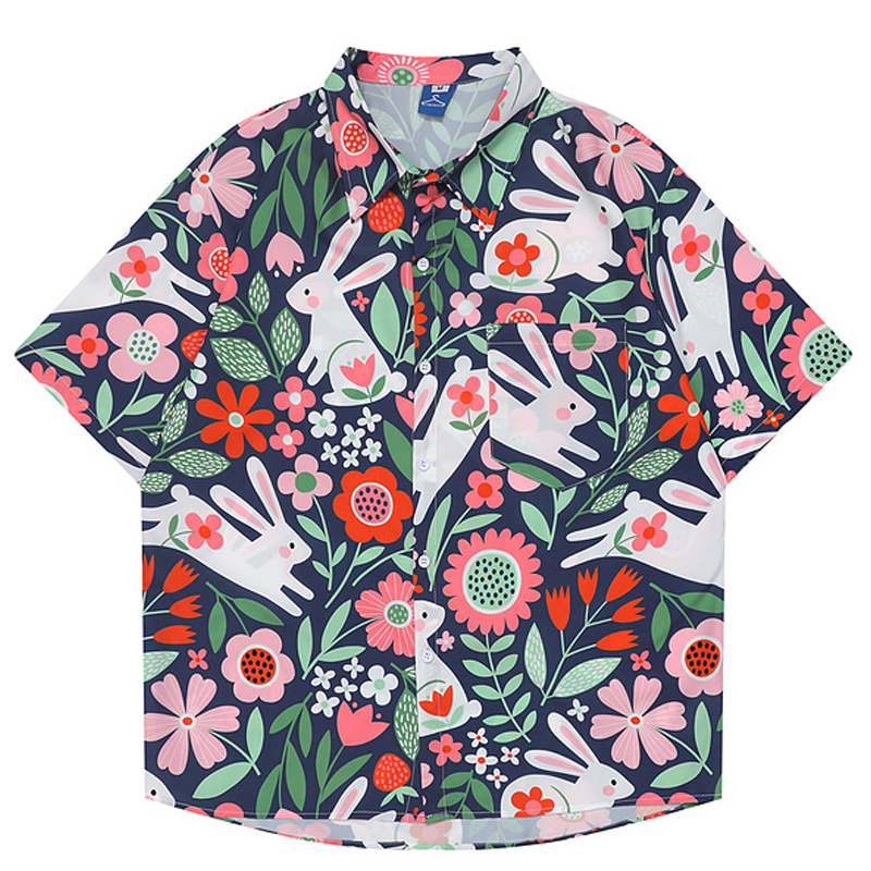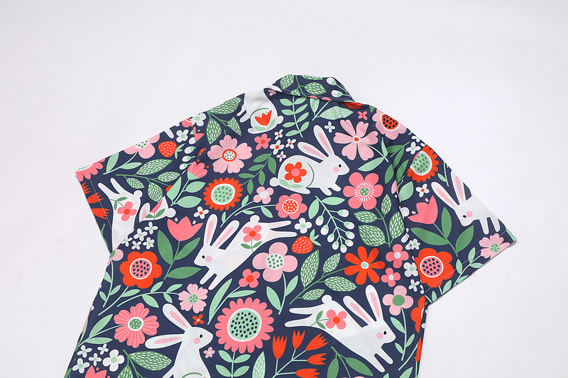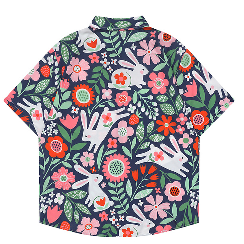 Short-sleeved collared button-up blouse with front pocket and an allover flower, leaves, and cartoon bunny pattern.