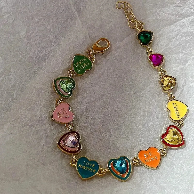 Indulge in some eye candy with this delightfully colorful bracelet that will make your heart skip a beat! Featuring multicolored candy hearts, this charming piece of jewelry is adjustable and easy to fasten with its convenient lobster clasp. It's a sweet addition to your collection that adds a playful touch to any outfit - and it's calorie-free!