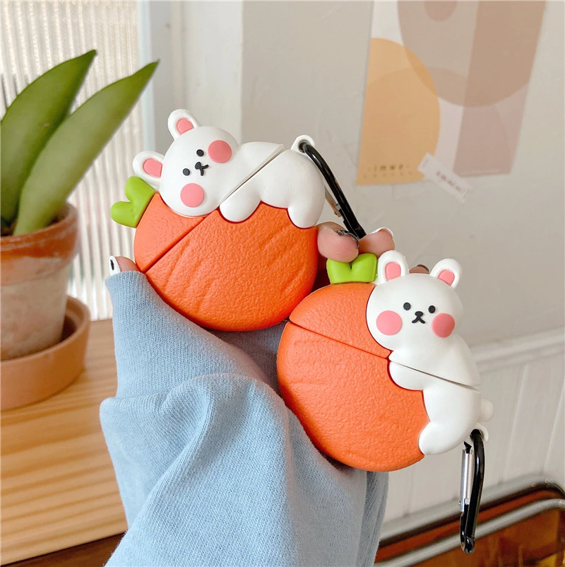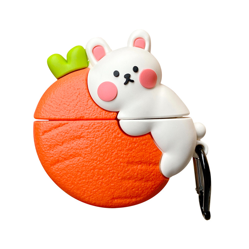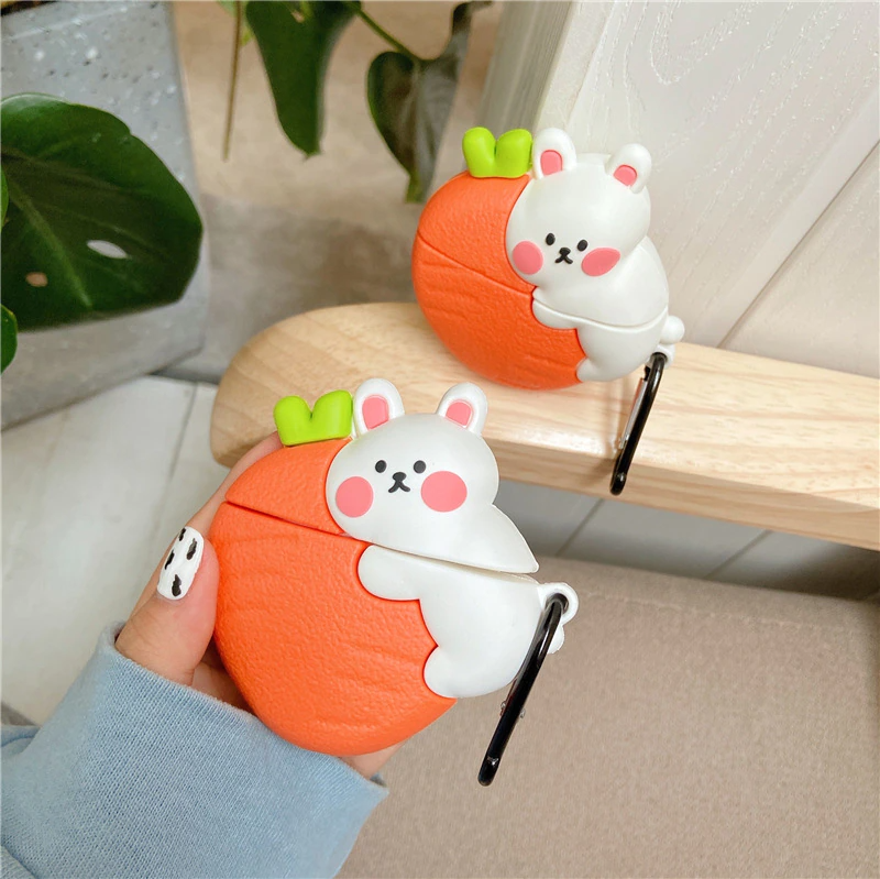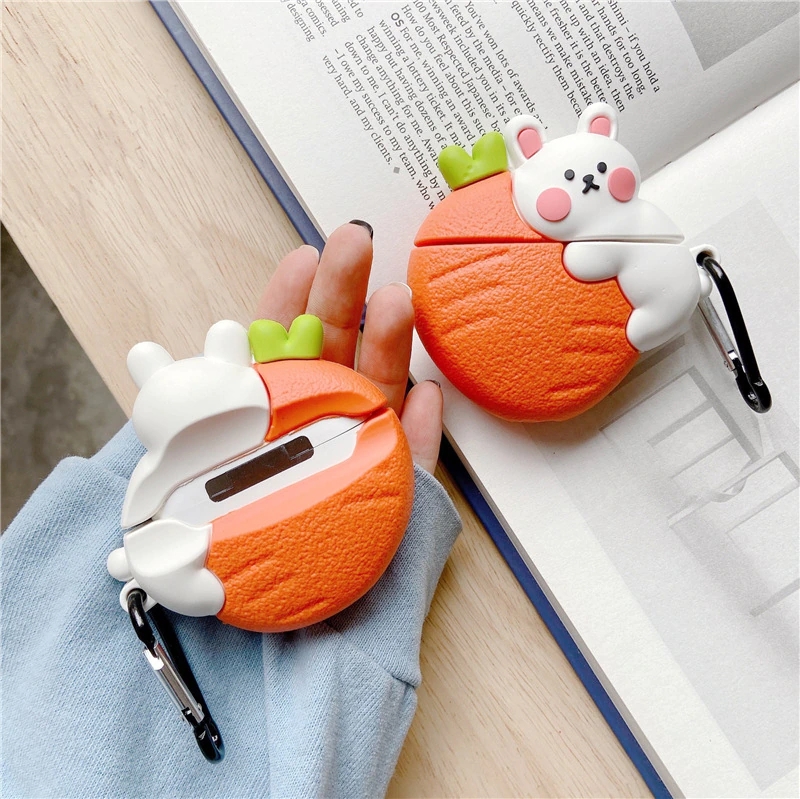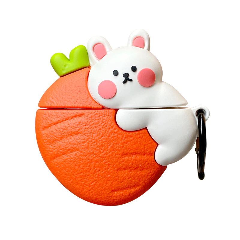 Cute soft protective cover for Airpod cases (Airpod charger case not included!) with clip in carrot + bunny rabbit design! Will fit Airpods 1/2 and Airpods pro cases.