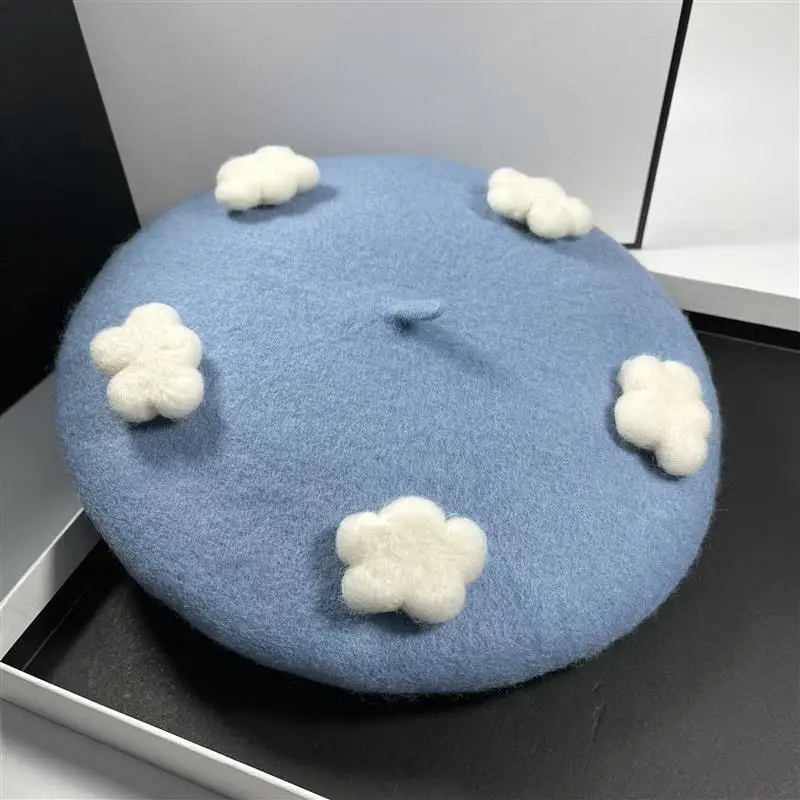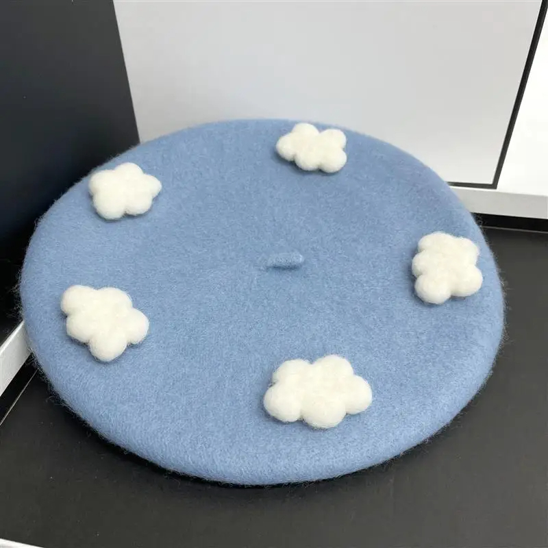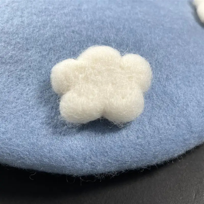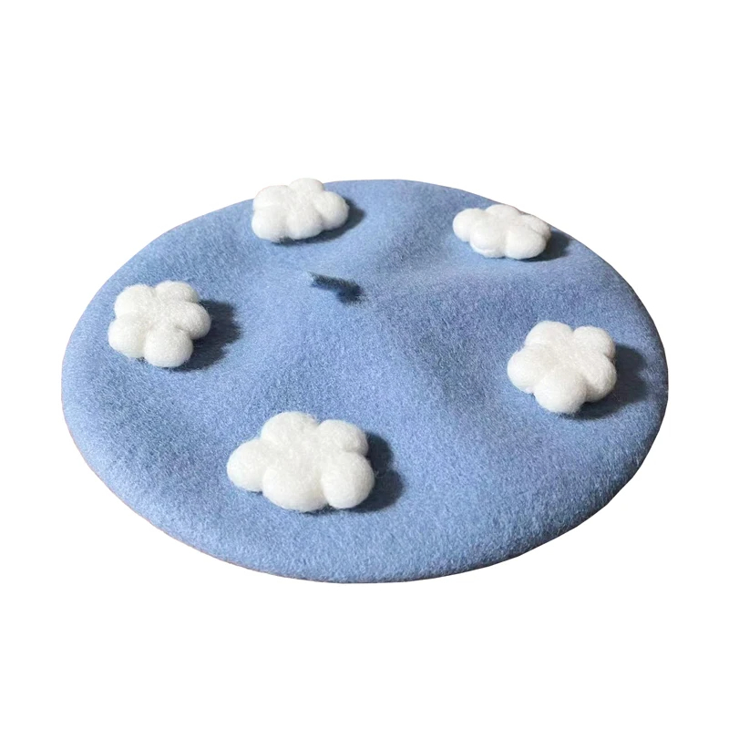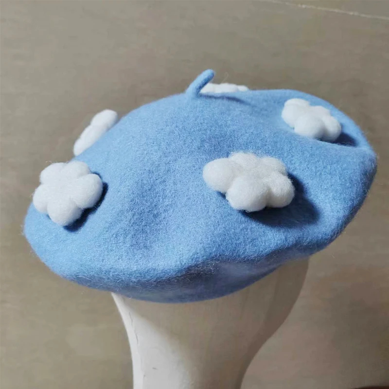 Indulge in your inner whimsy with this sky blue felted beret adorned with fluffy white clouds. Whether you're strolling through a Parisian street or keeping your head warm on a chilly day, this hat will add a touch of charm to any outfit. The sky's the limit when it comes to cloud-inspired fashion!