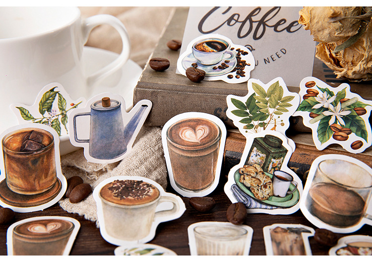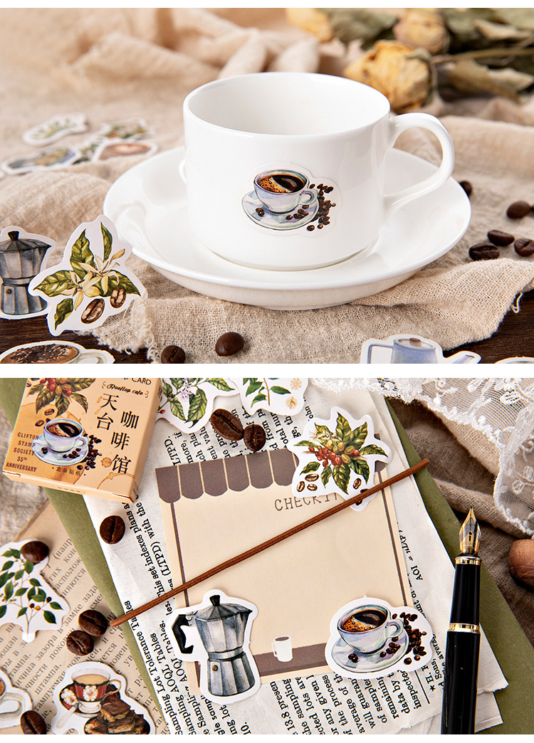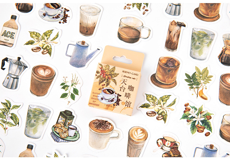 Pack of adorable illustrated stickers with a coffee and hot drinks theme: 46 stickers total, box is 4.4X4.4X1.1CM big.