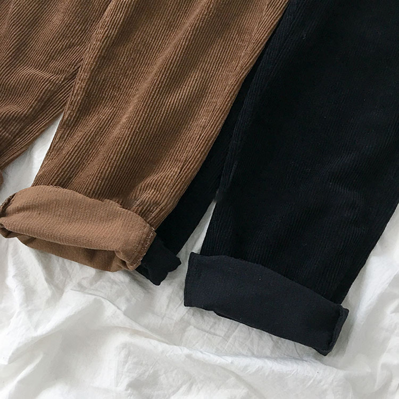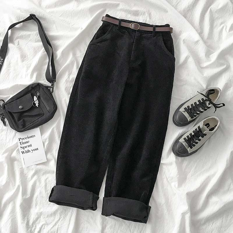 Vintage style corduroy trousers! Pants have a button zip closure and two front and back pockets. Comes with belt, available in black and brown.