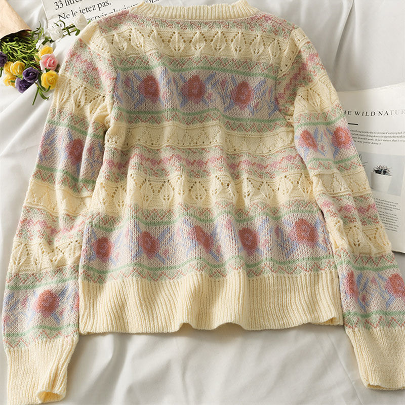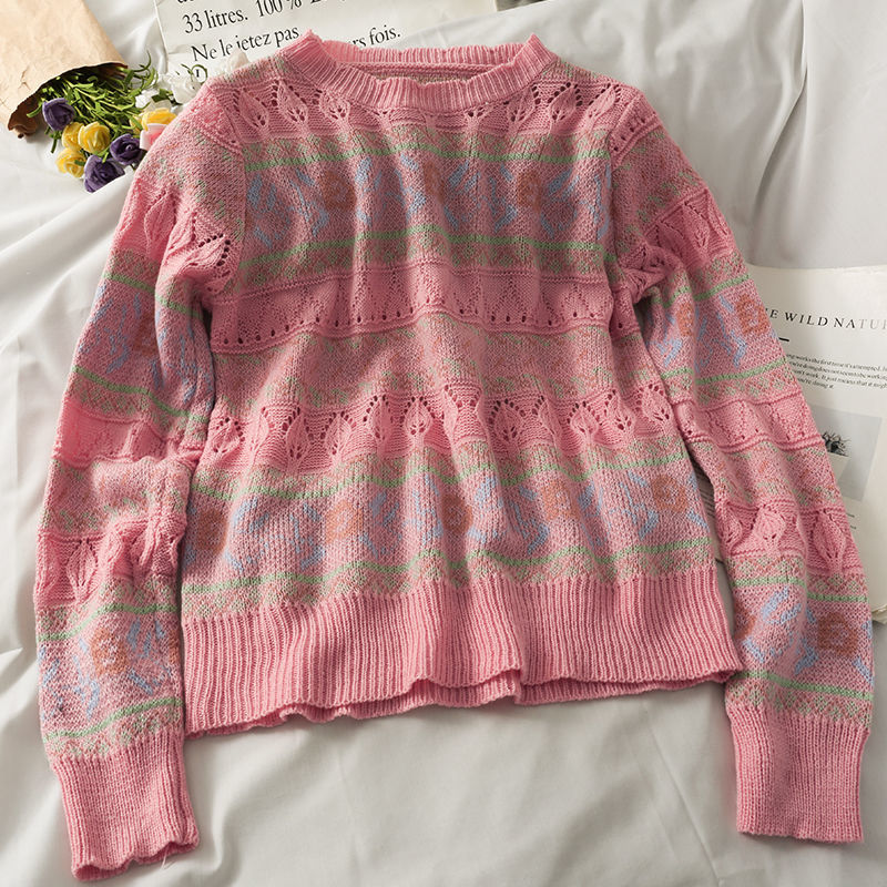 Lightweight cottagecore style long-sleeved knit with repeating flower and shape pattern, available in three different colours.