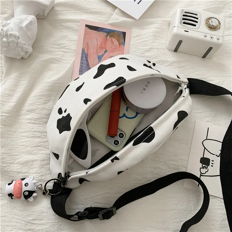Moo've over boring bags, this Cow Spot Pattern Bum Bag is udderly delightful! Perfect for storing all your essentials while adding a playful touch to your outfit. With its charming cow spot design and adorable attached cow character charm, this bag is perfect for all cow lovers. Yee-haw!