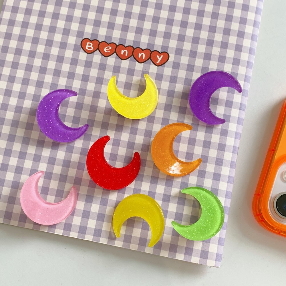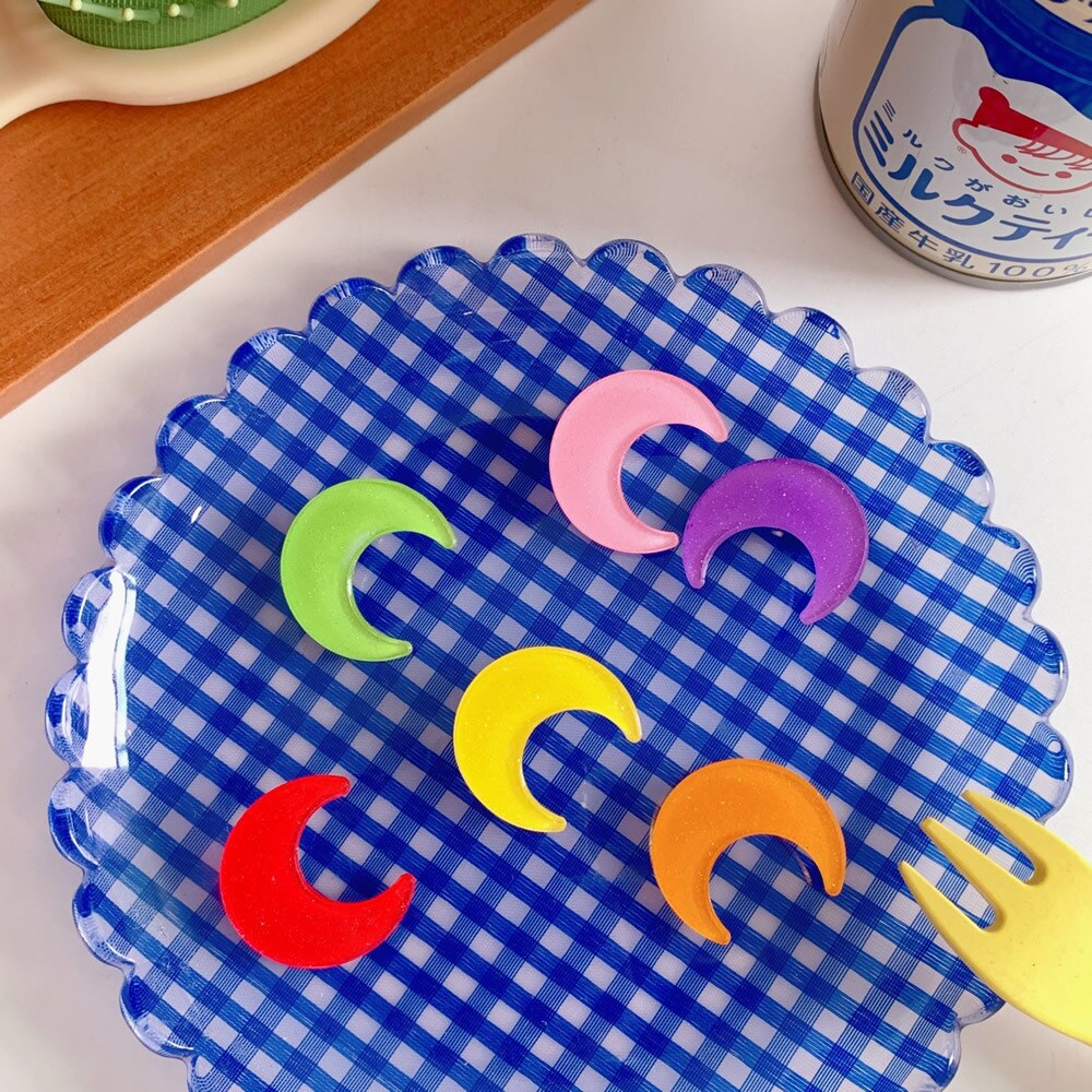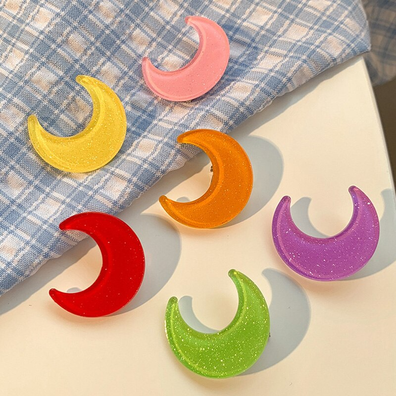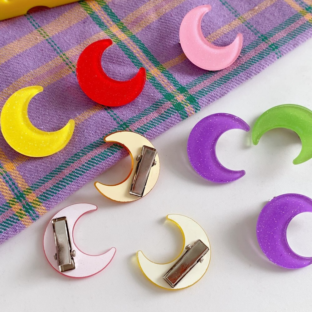 Glossy acrylic glitter hair clip with duckbill closure in the shape of crescent moon! Available in six different colours, 2CM big.