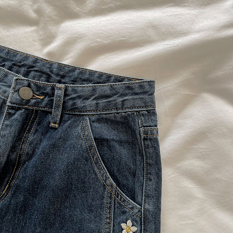Vintage style dark wash denim trousers with embroidered white and yellow daisies on the pant leg sides! Pants have a button zip closure and two front and back pockets.