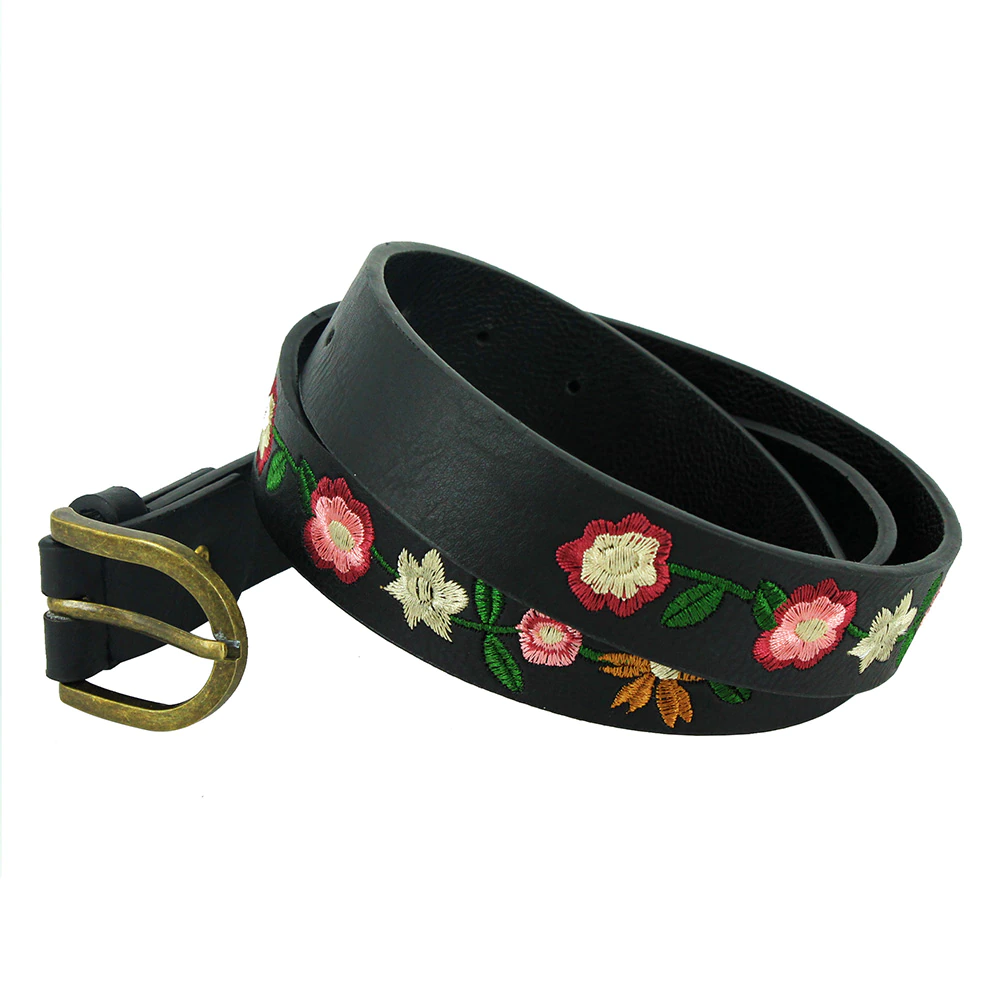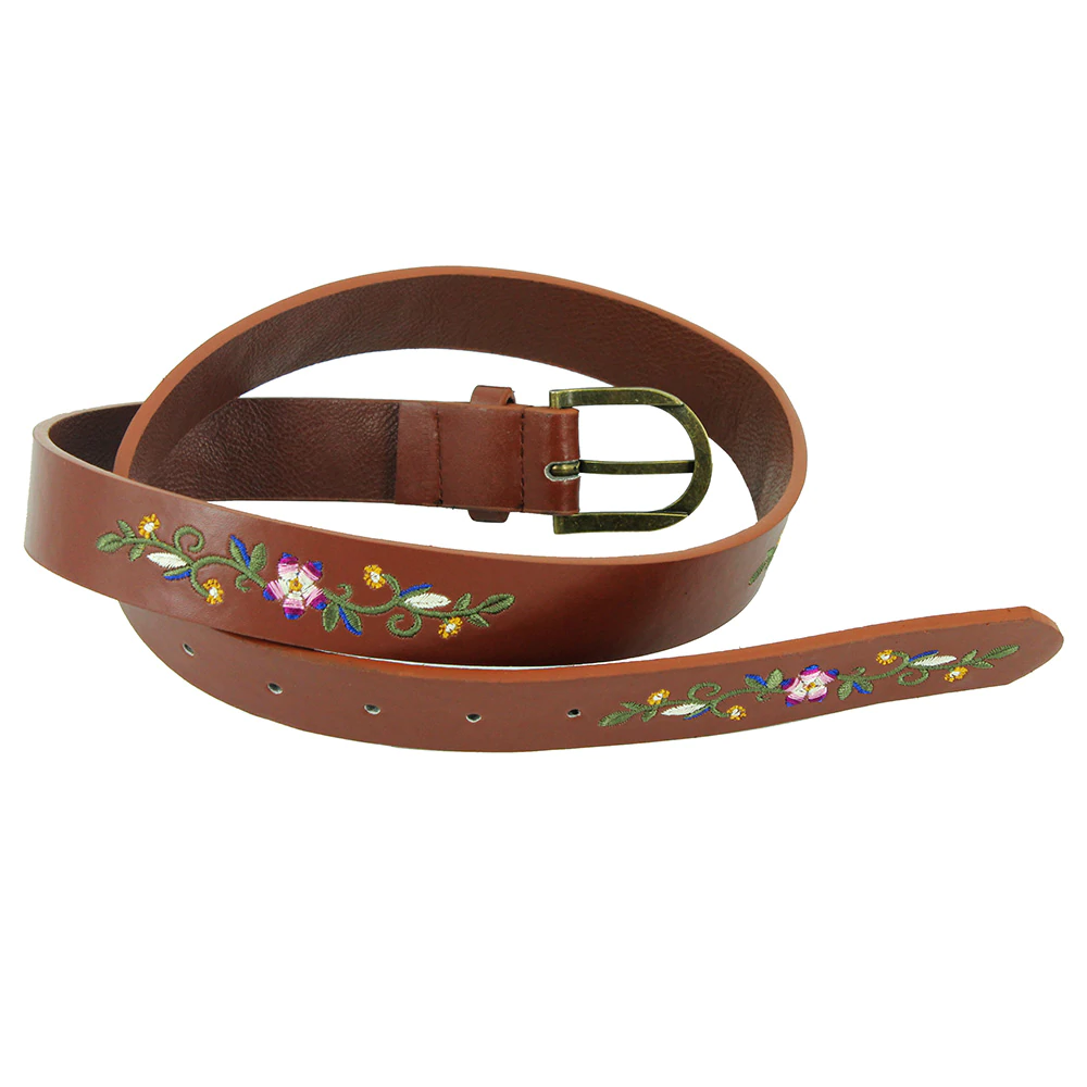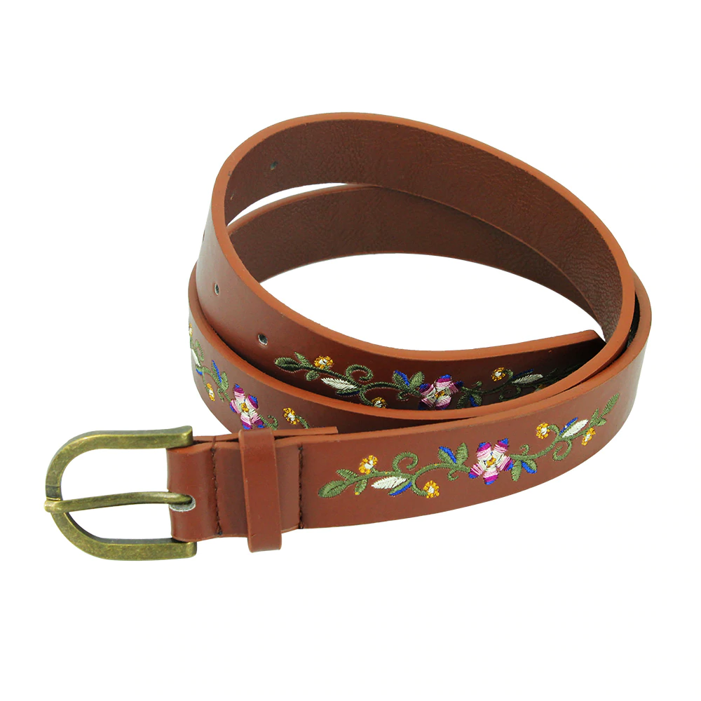 Faux leather belt with floral embroidery detailing, 103 cm long, available in brown and black.
