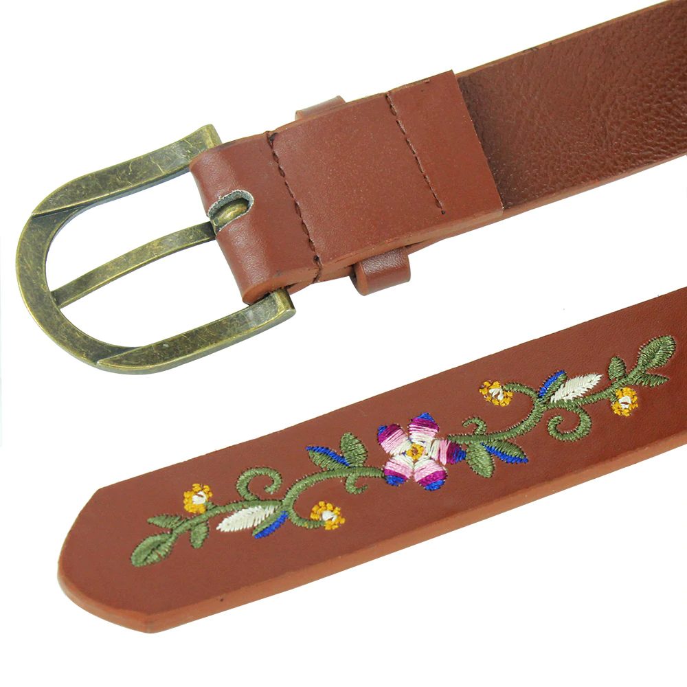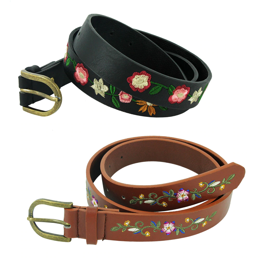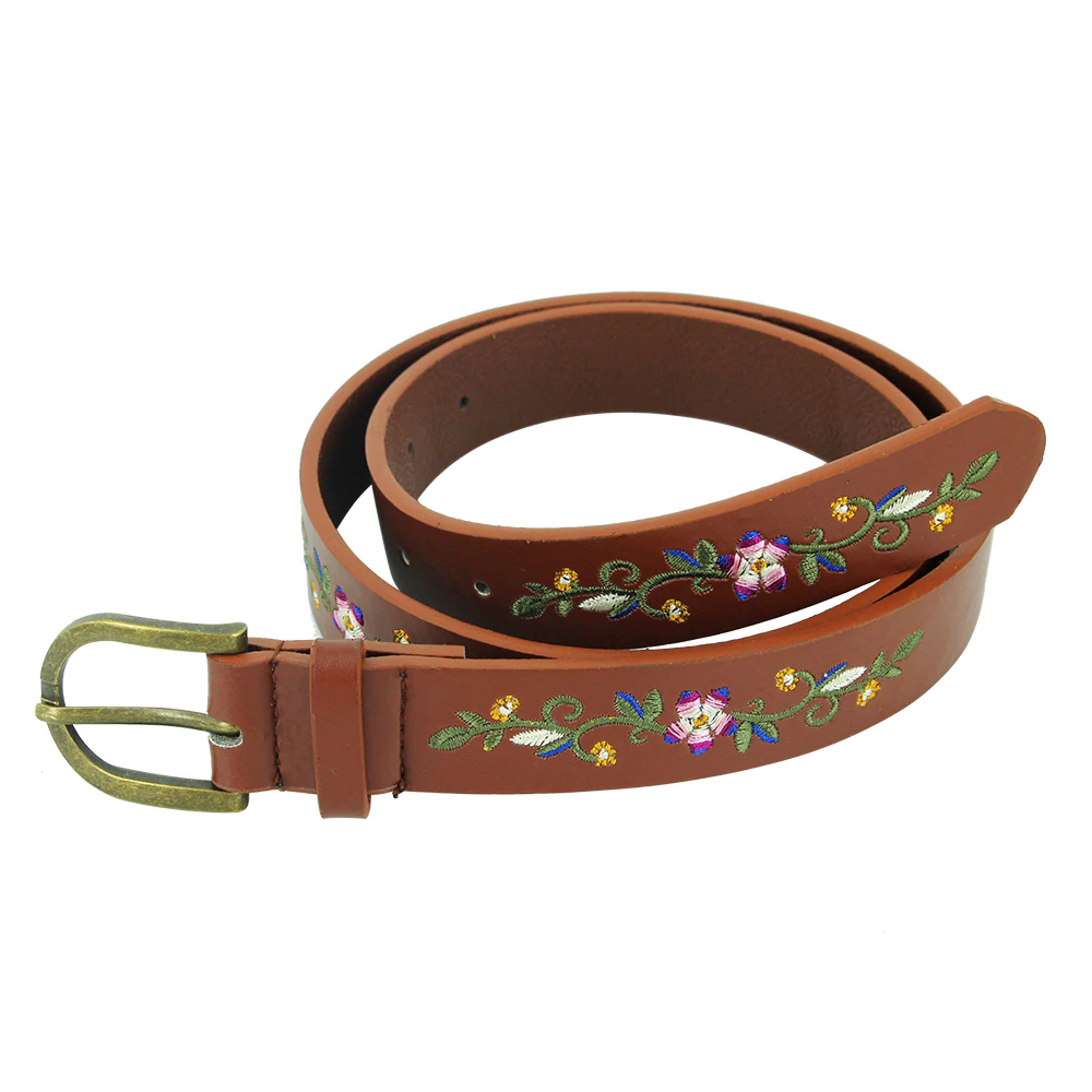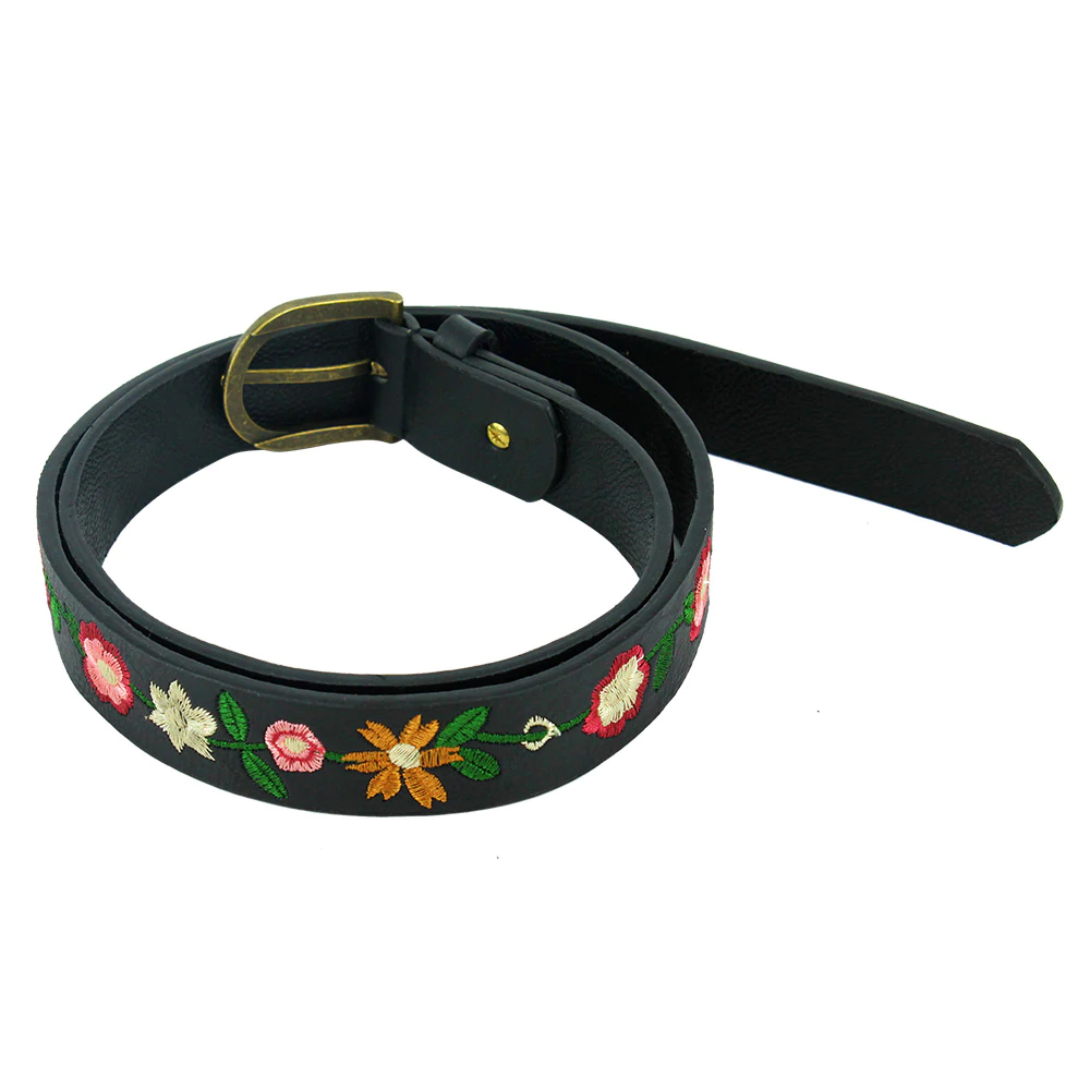 Faux leather belt with floral embroidery detailing, 103 cm long, available in brown and black.