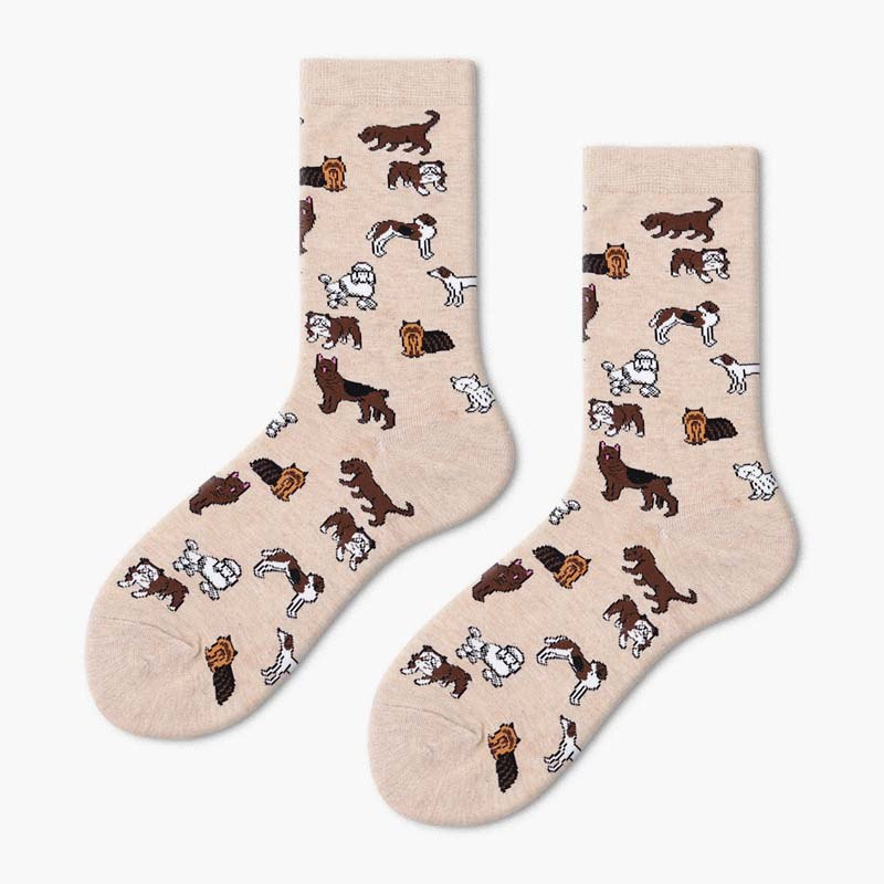 Beige socks with allover dog illustration pattern, will fit up to a size EU40