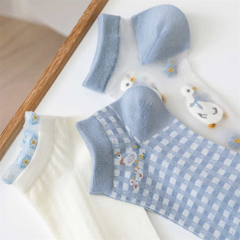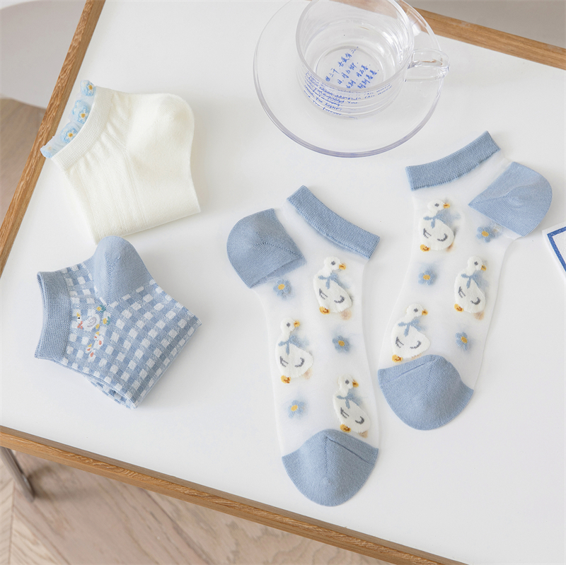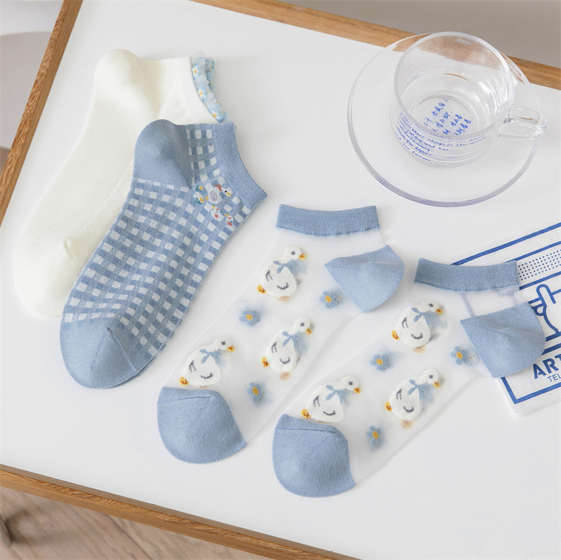 Pretty sheer socks with cottagecore duck theme! Available in three different designs, will fit up to a size EU89.