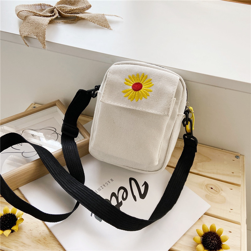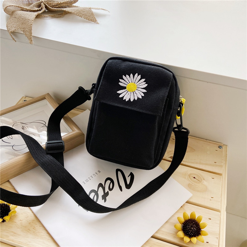 Cute miniature shoulder bag with daisy embroidery on the front flap of a magnet closure compartment, main zippered compartment and adjustable black shoulder strap. Available in four different colours.