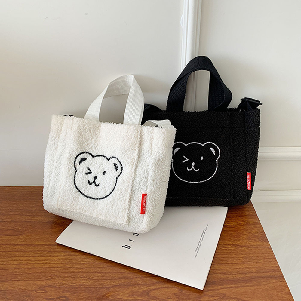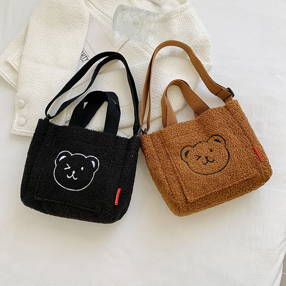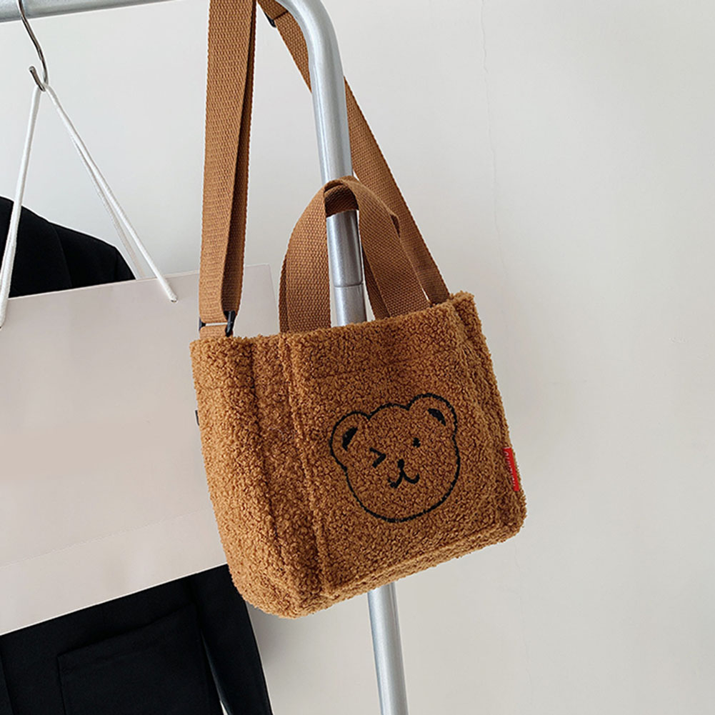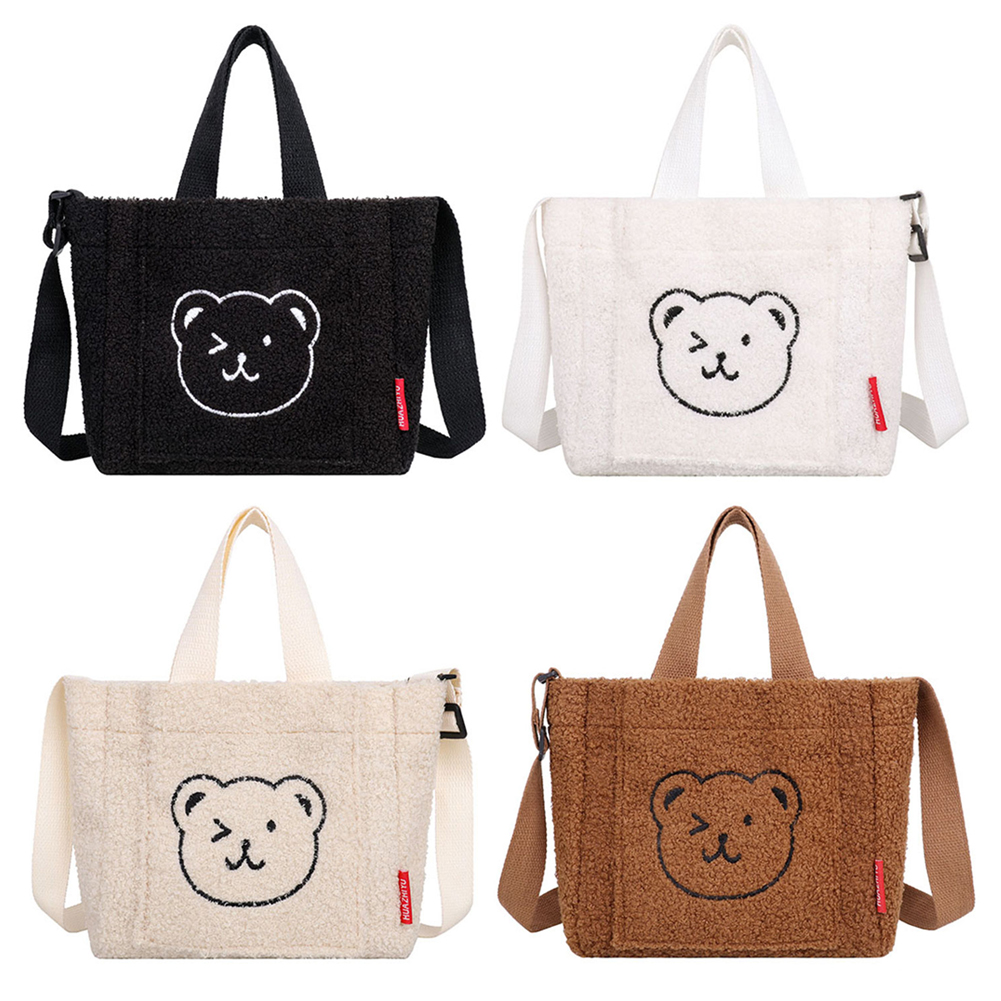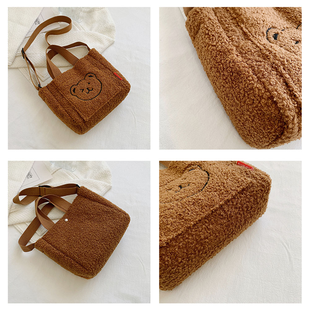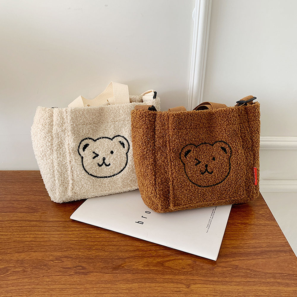 Super cute teddy bear face plush shoulder bag with handles and adjustable shoulder strap, available in four different colours.