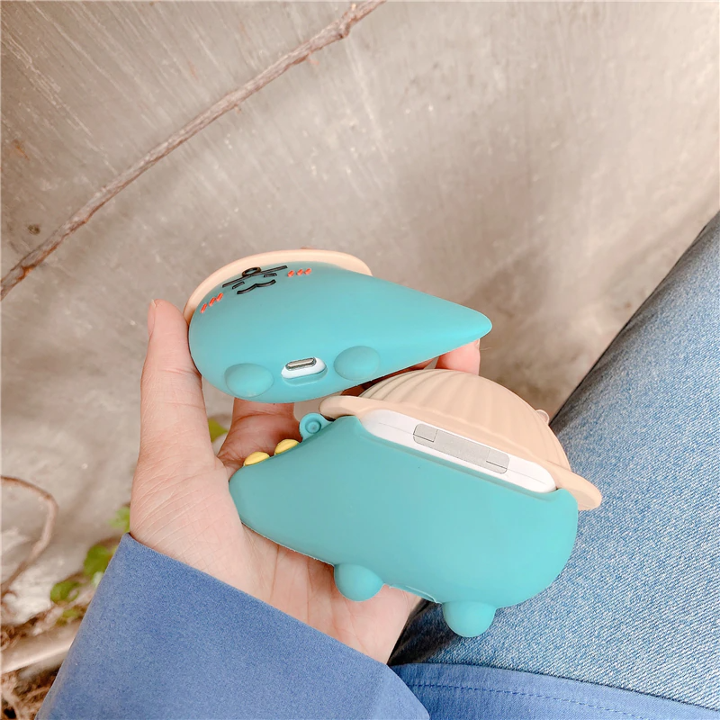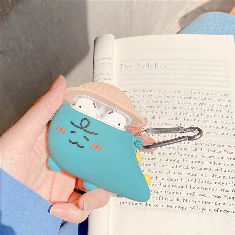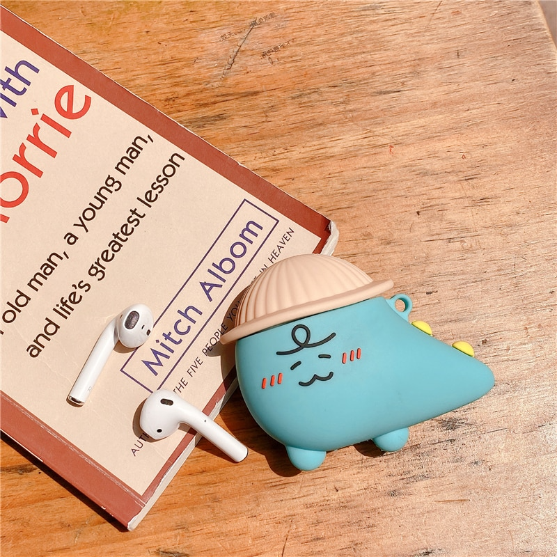 Cute soft protective cover for Airpod cases (Airpod charger case not included!) with clip, shaped like a cute green dinosaur wearing a little hat! Will fit Airpods 1/2 and Airpods Pro.