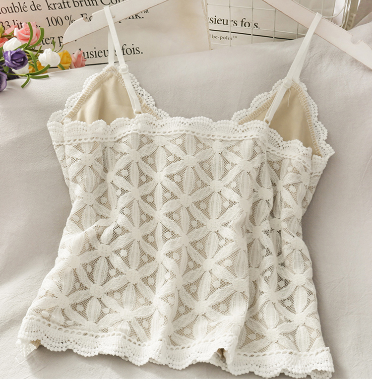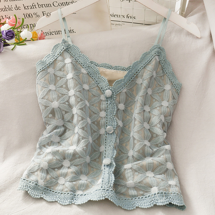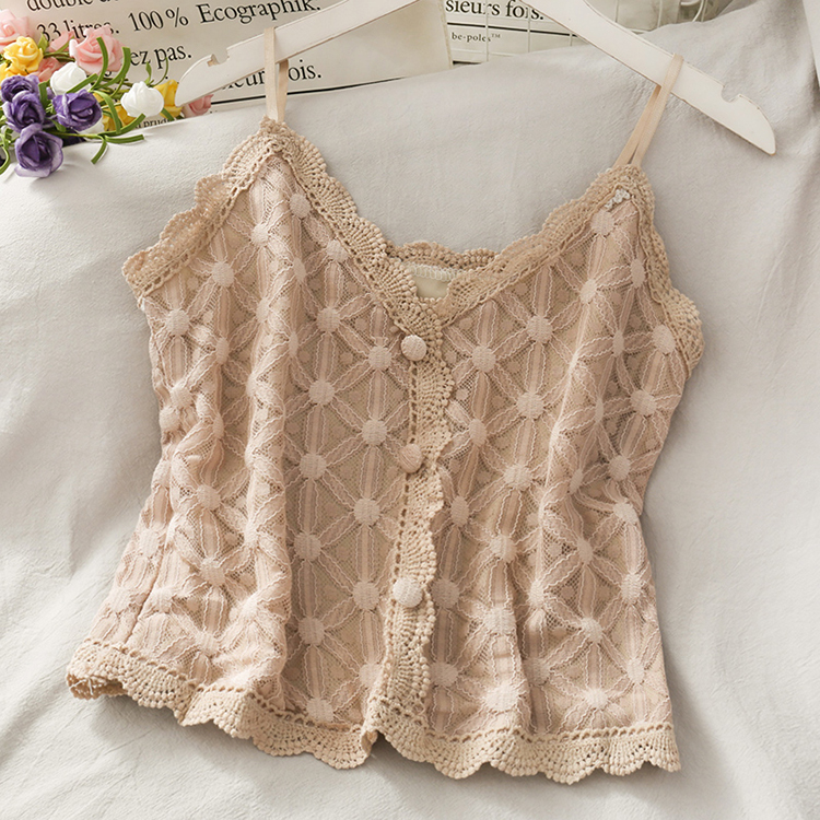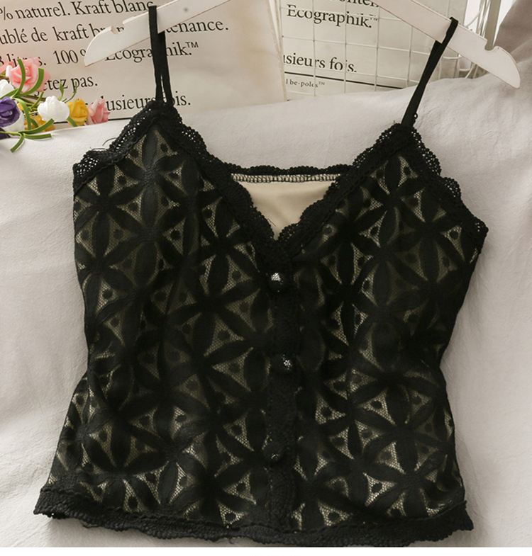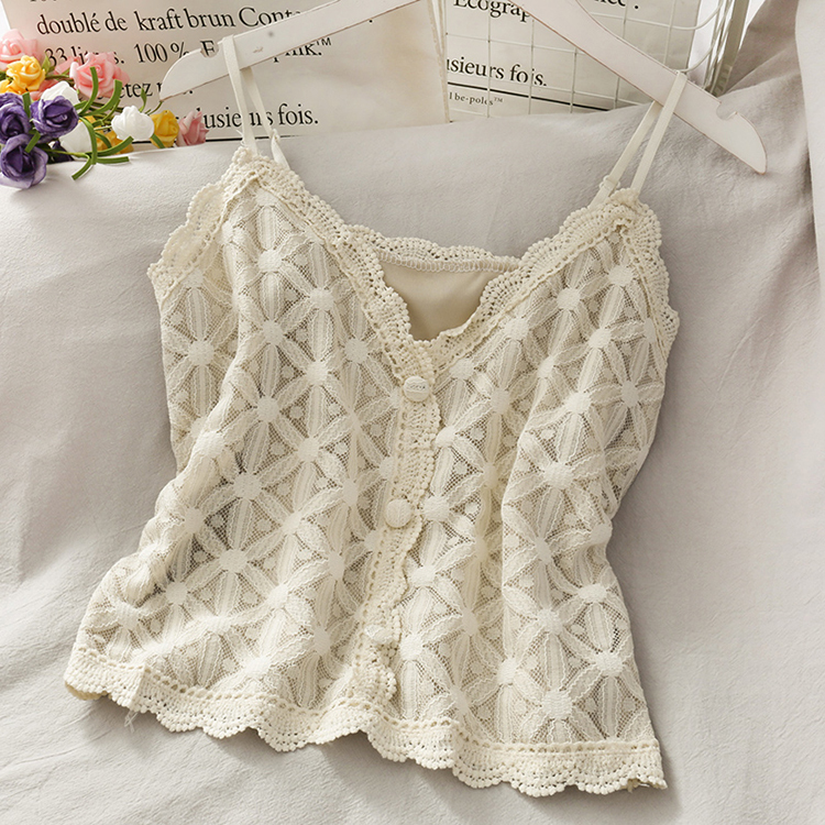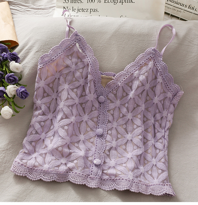 Spaghetti strap top with flower pattern lace detailing, beige lining, and decorative buttons, available in six different colours.
