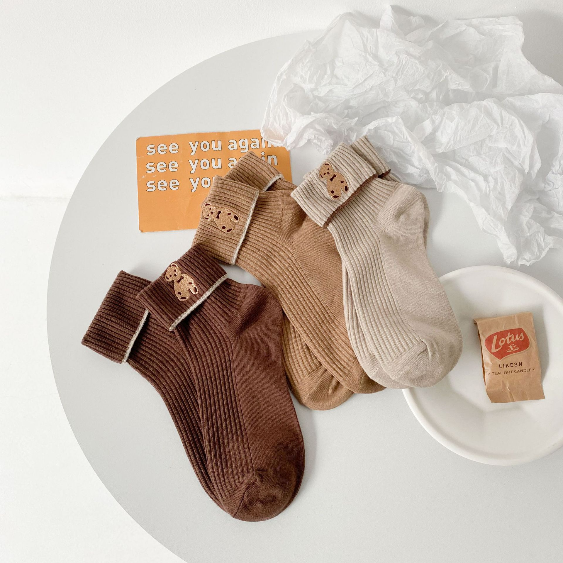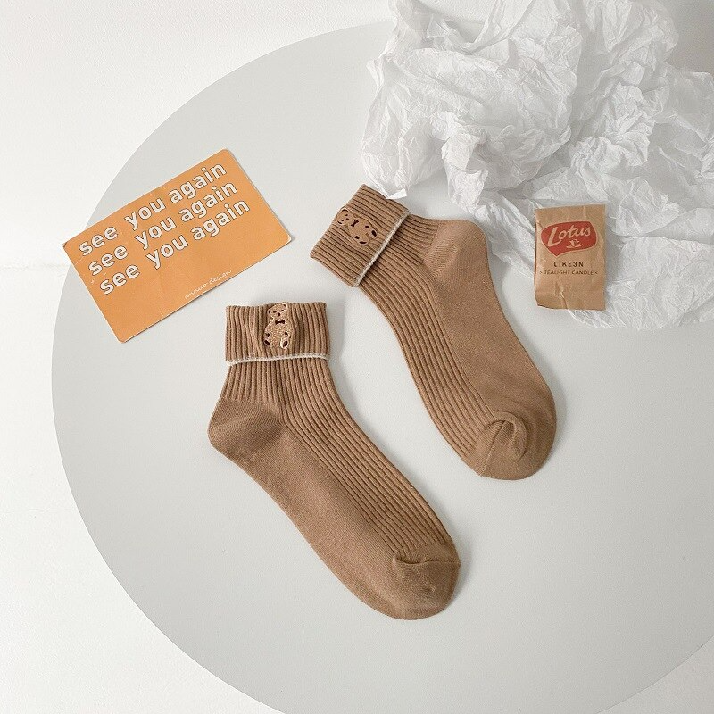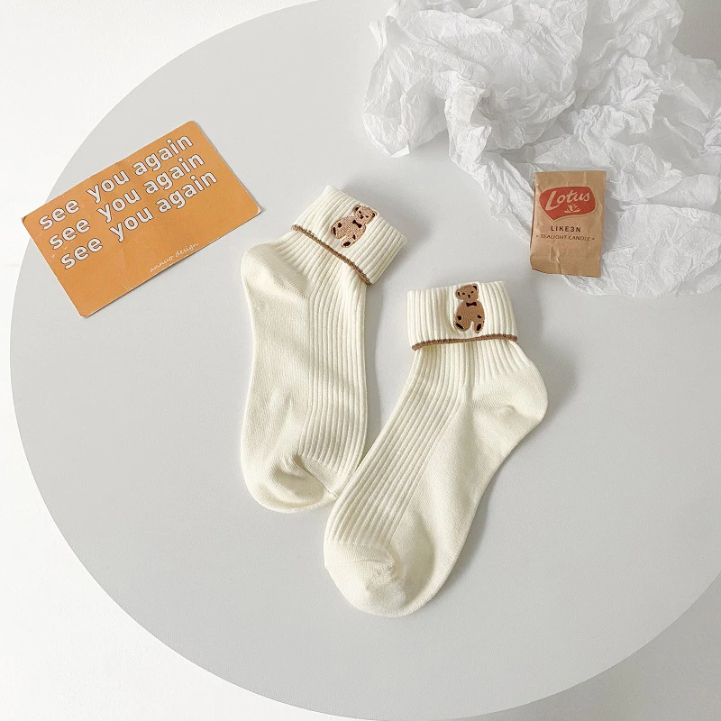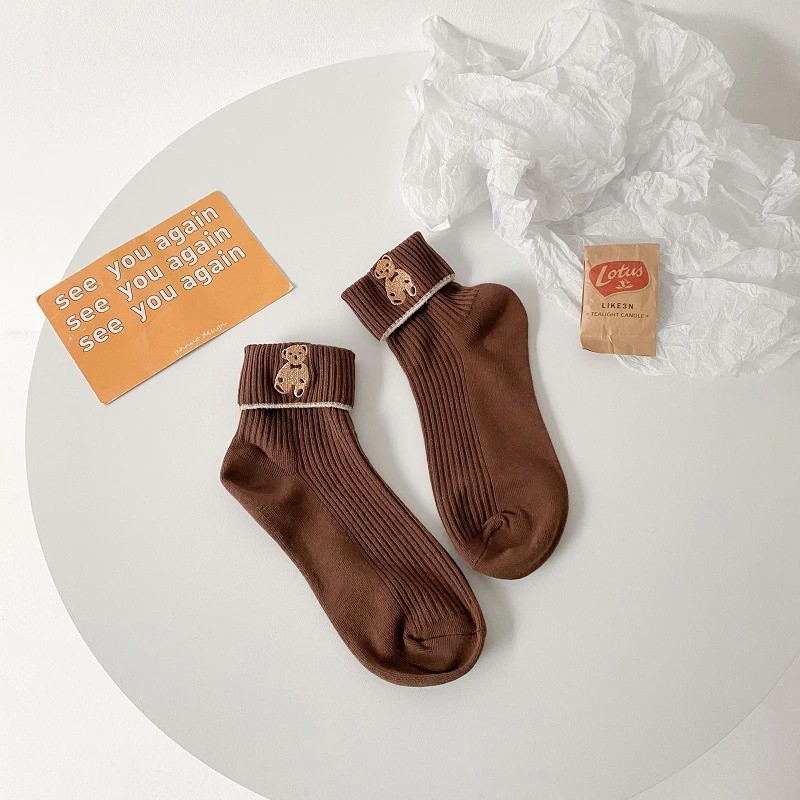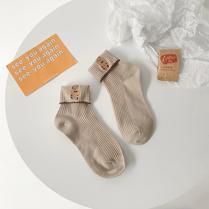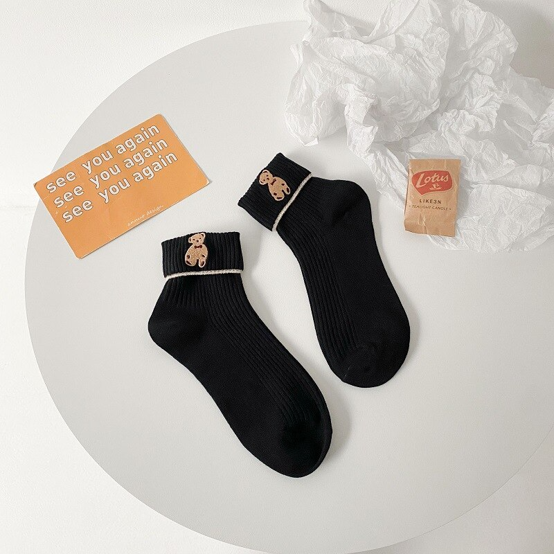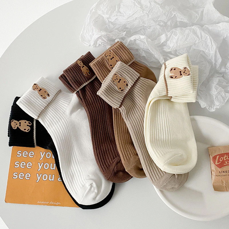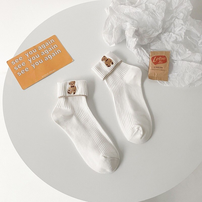 Foldover Teddy Bear Embroidery Crew Socks (6 Colours)