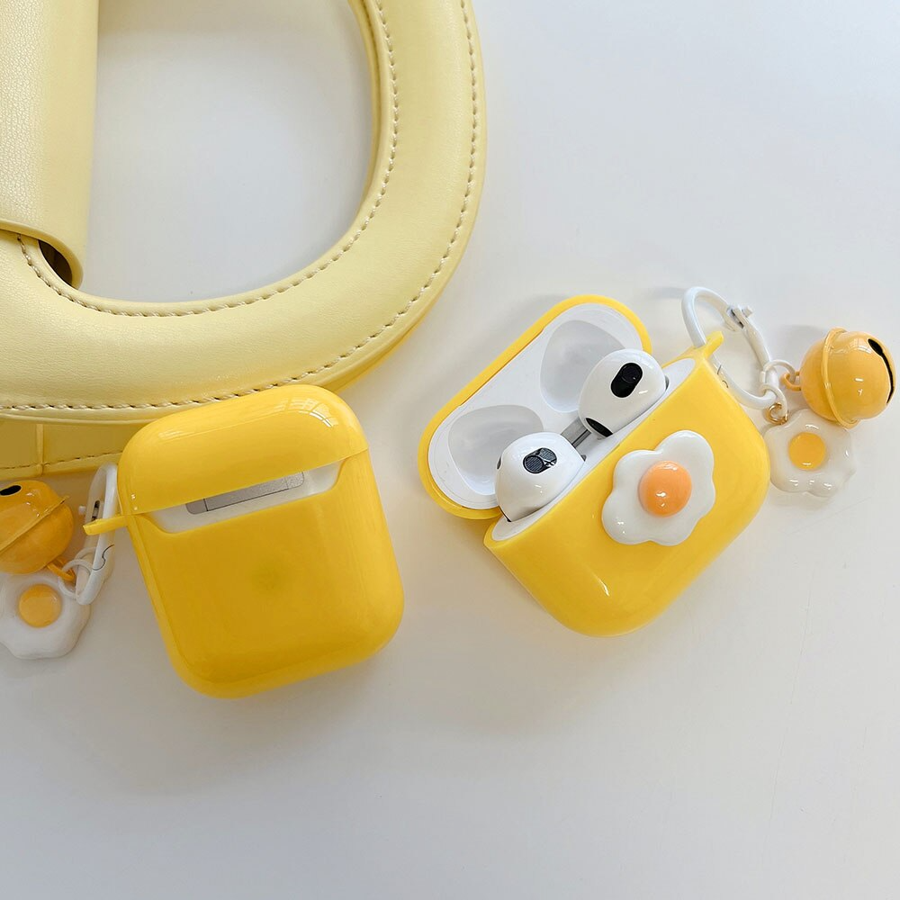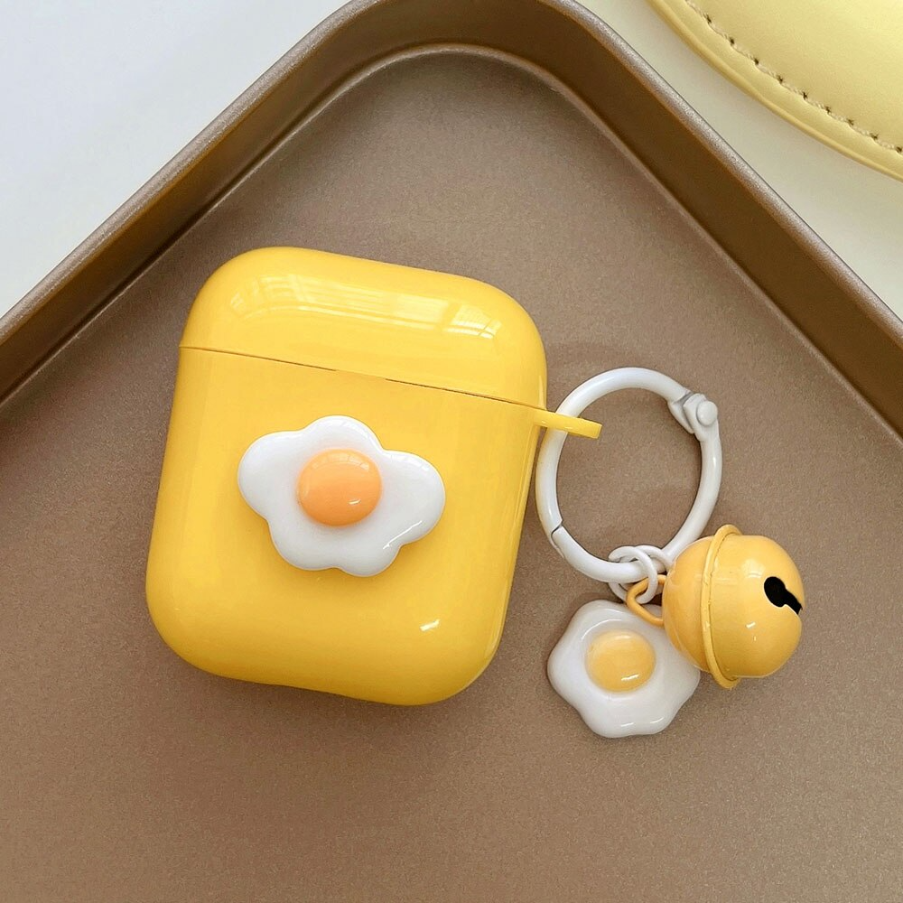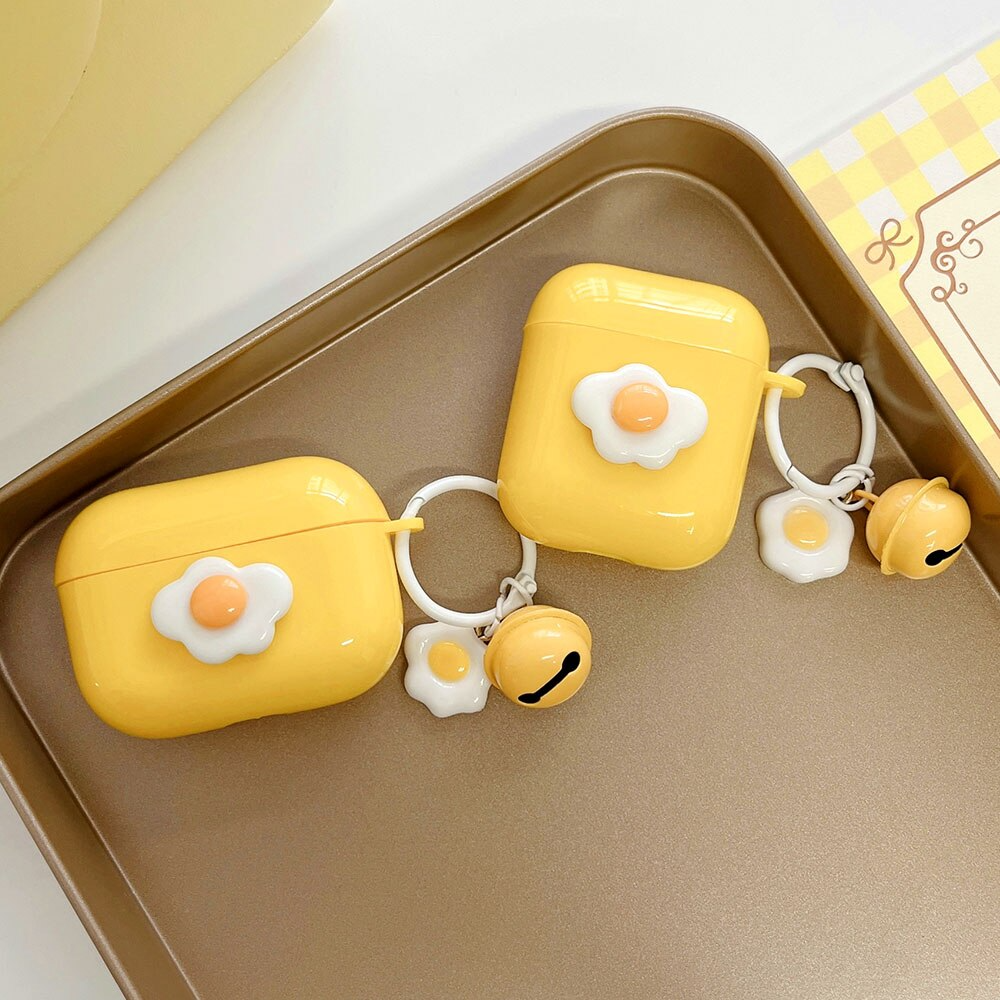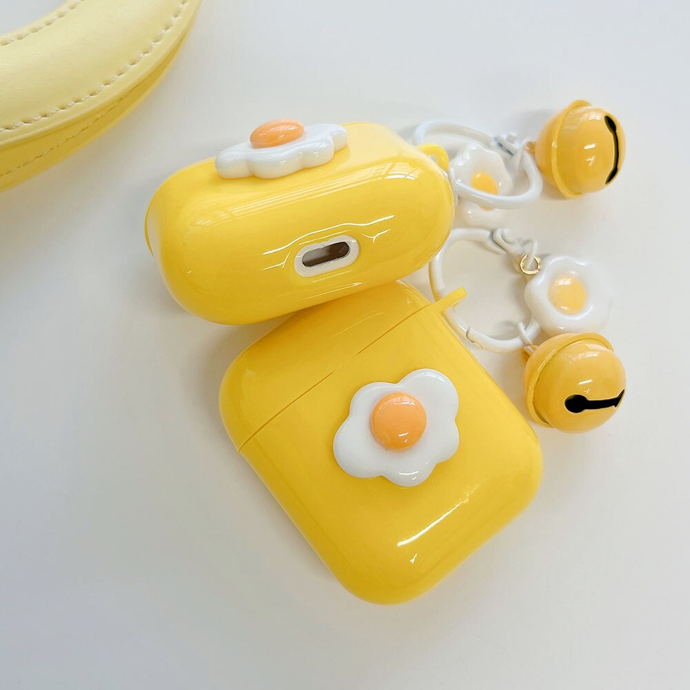 Cute yellow protective cover for AirPods cases (AirPods charger case not included) with 3D fried egg, clasp ring and yellow bell and egg charm!