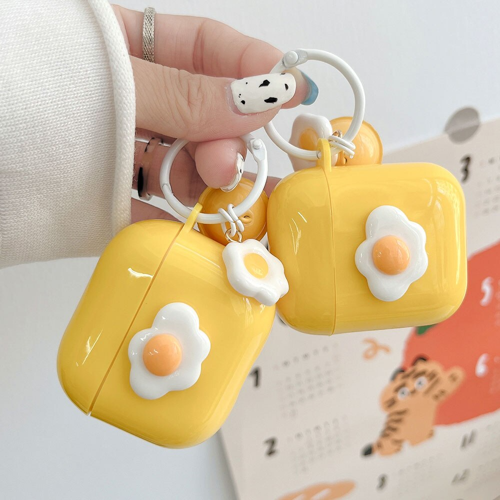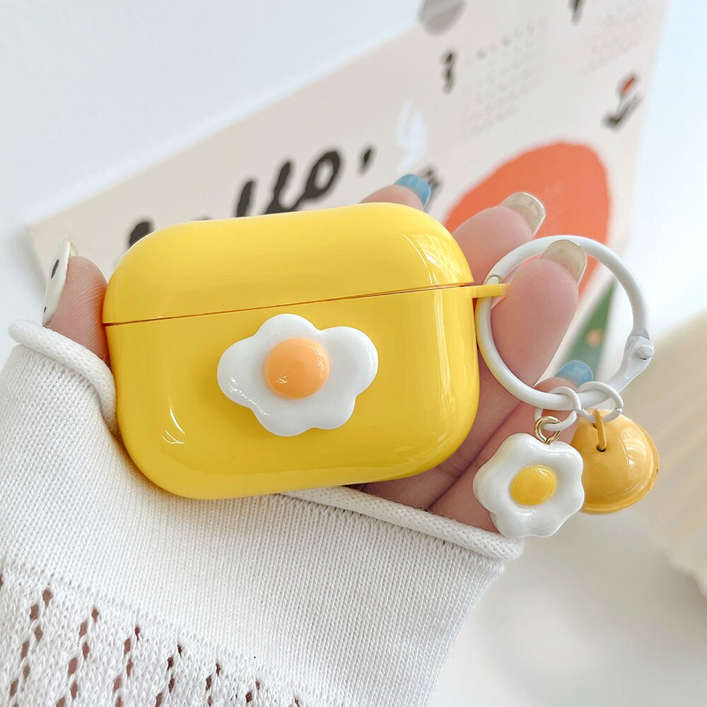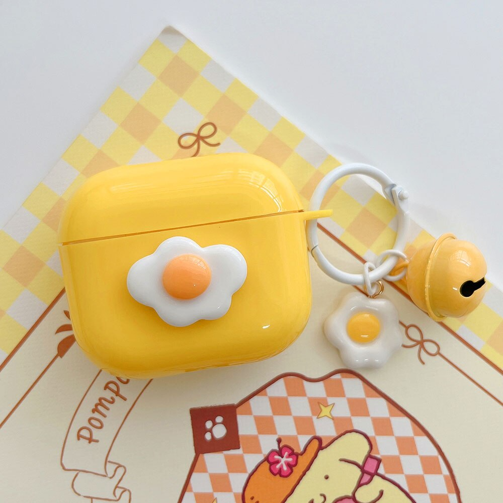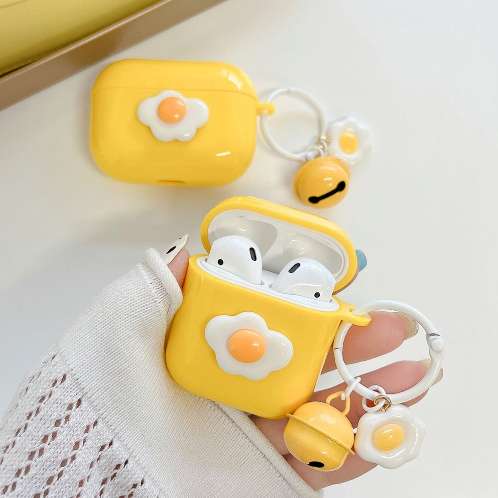 Cute yellow protective cover for AirPods cases (AirPods charger case not included) with 3D fried egg, clasp ring and yellow bell and egg charm!