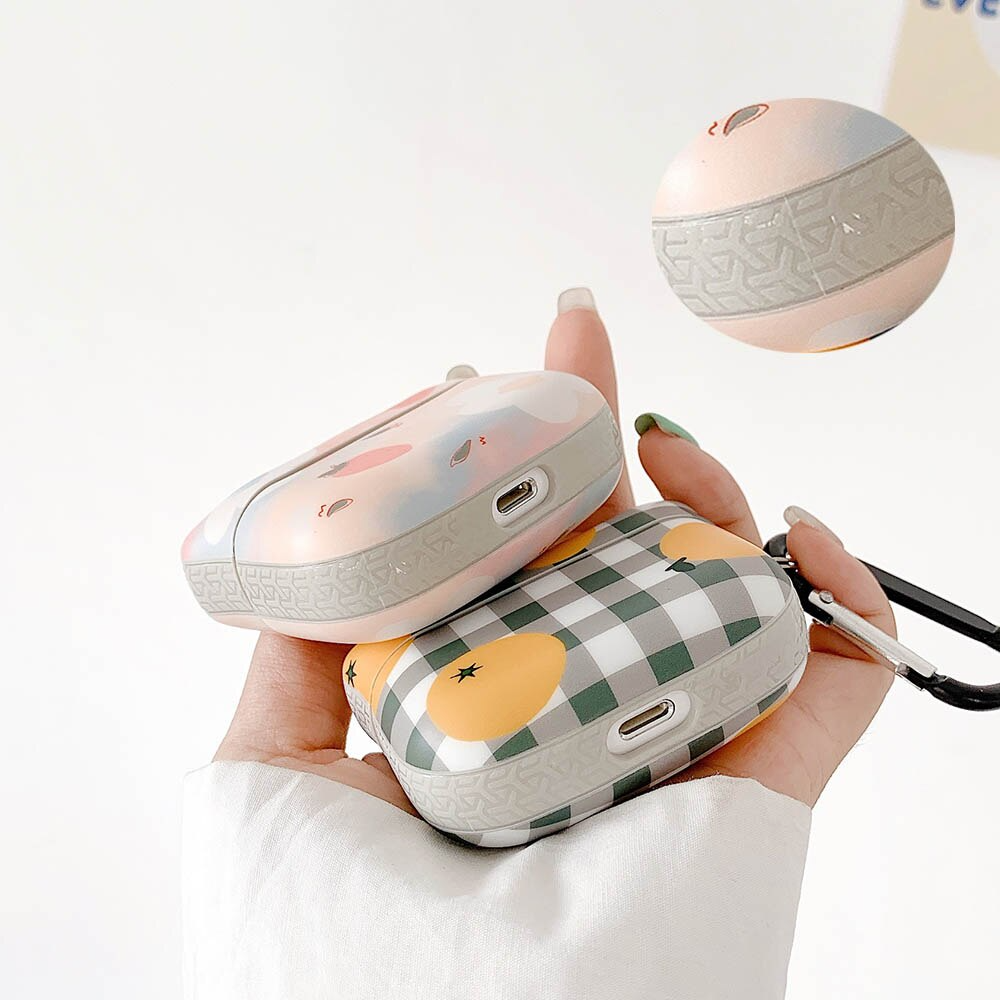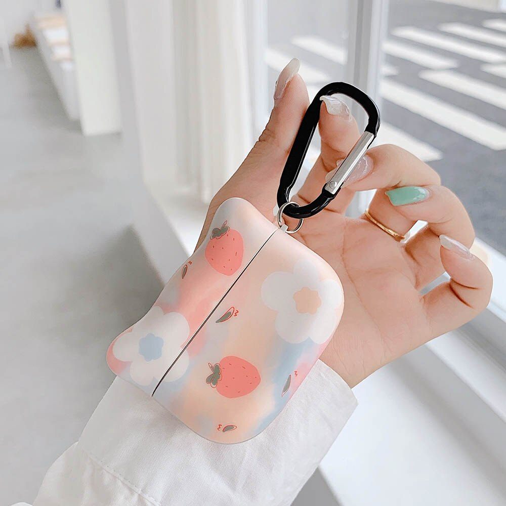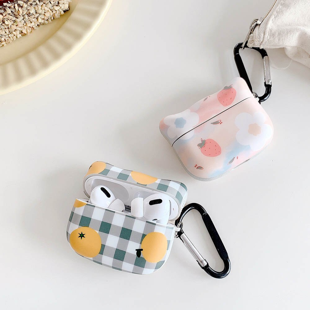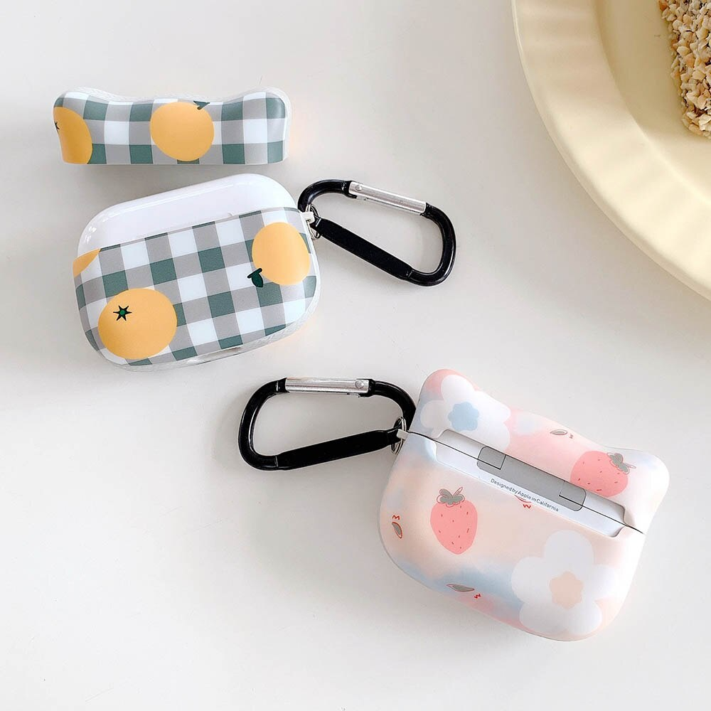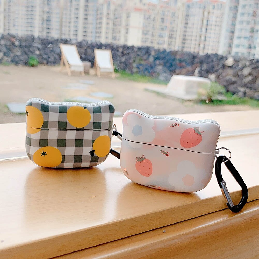 Protective cover for AirPods cases (Airpods charger case not included!) with fruit pattern, attached clasp and little cat ear design feature, available in green ginham with orange pattern or pink flowery strawberry pattern.