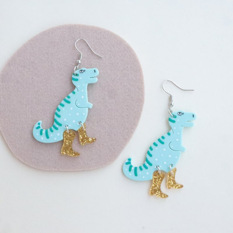 Add a fun and fierce vibe to your look with these Glam Rock T-Rex Acrylic Earrings. Featuring a playful blue dinosaur rocking sparkly gold boots, these lightweight earrings bring a touch of quirky charm and bold style. Perfect for dinosaur lovers and those who want to stand out, they add a unique, eye-catching accessory to any outfit. Durable and comfortable, these earrings make a fantastic gift or a whimsical treat for yourself. Let your wild side shine with this rockstar dino duo!