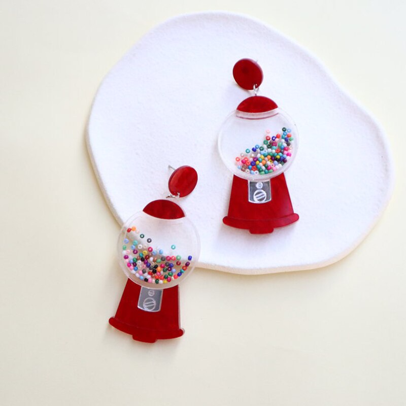Cute red earrings shaped like a gacha style gum ball machine with clear shaker compartment filled with moving candy beads! 3.5X8cm big.