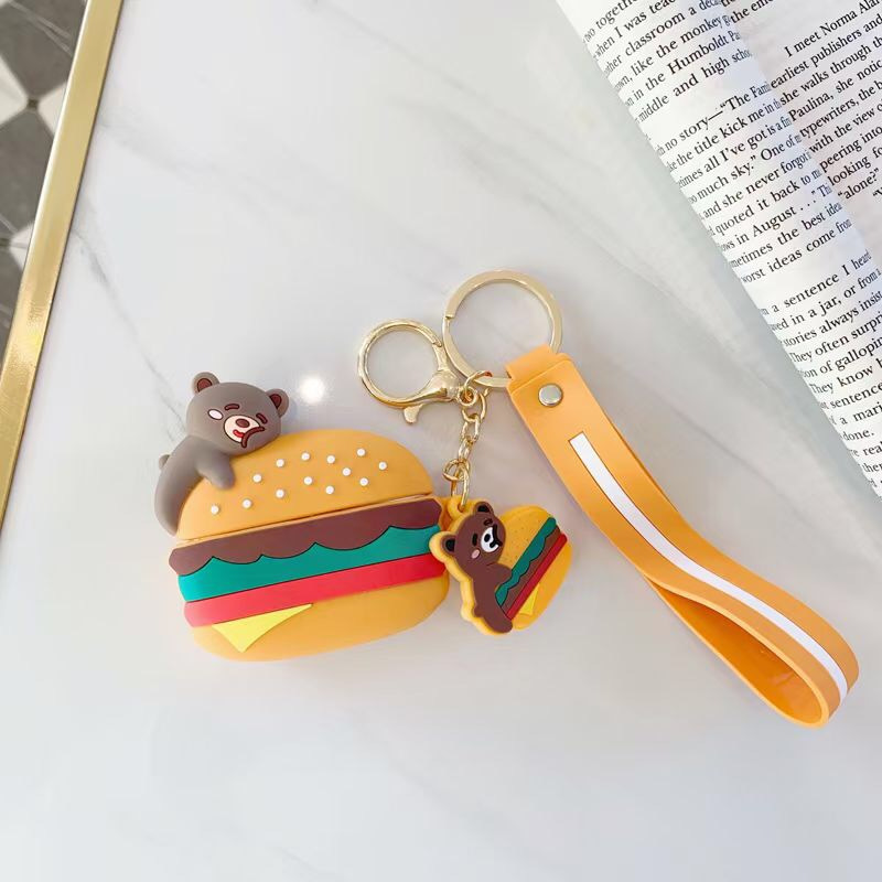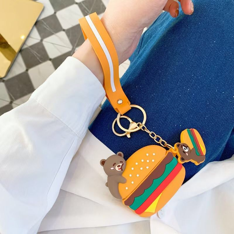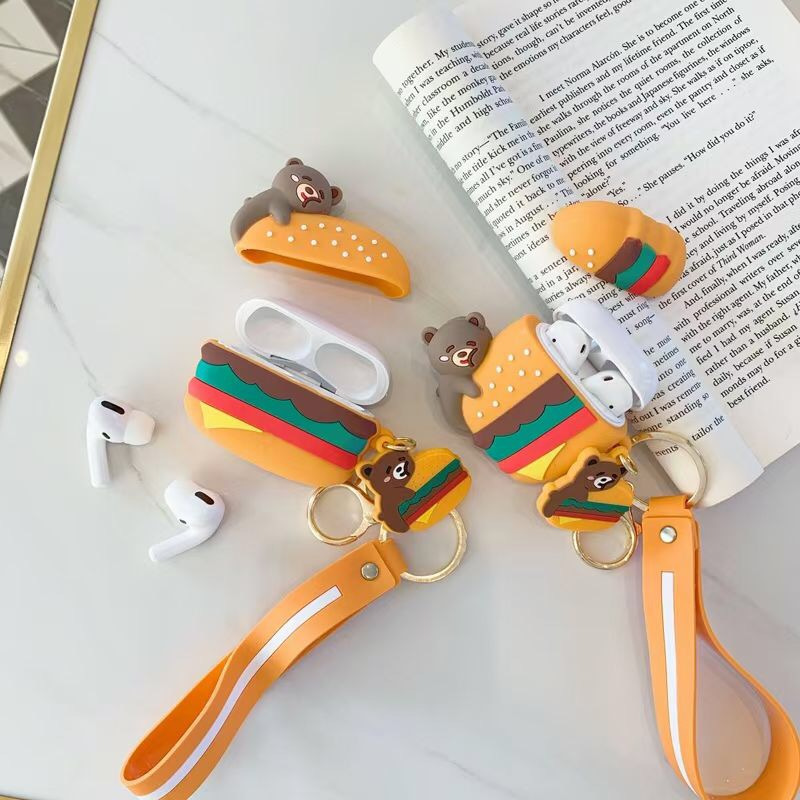 Cute soft protective cover for Airpod cases (Airpod charger case not included!) with clip strap in hamburger + teddy bear design! Will fit Airpods 1/2 and Airpods pro cases.