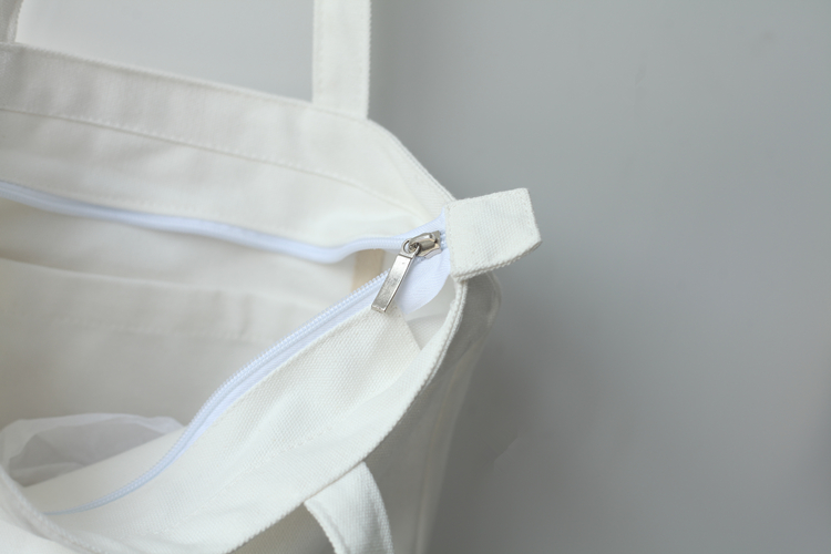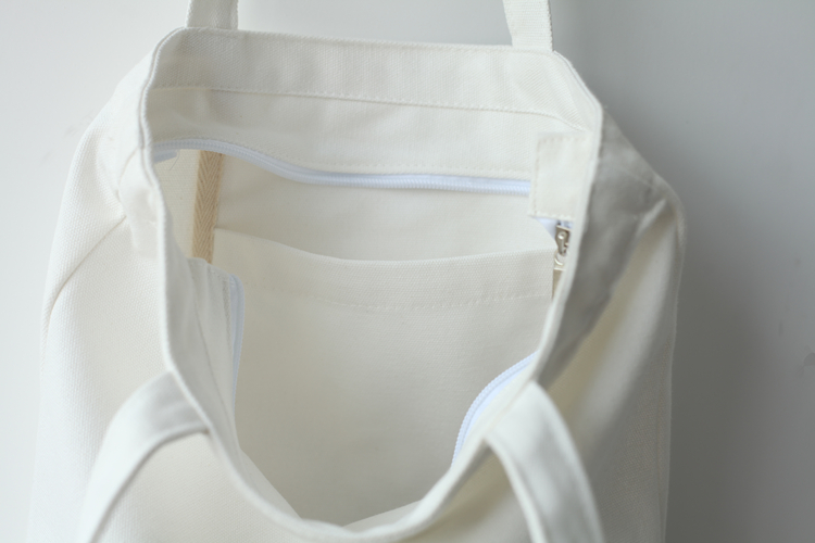 White tote bag with Hisashi Eguchi lipstick girl comic print on the side. Bag has a zipper closure and inner pocket.