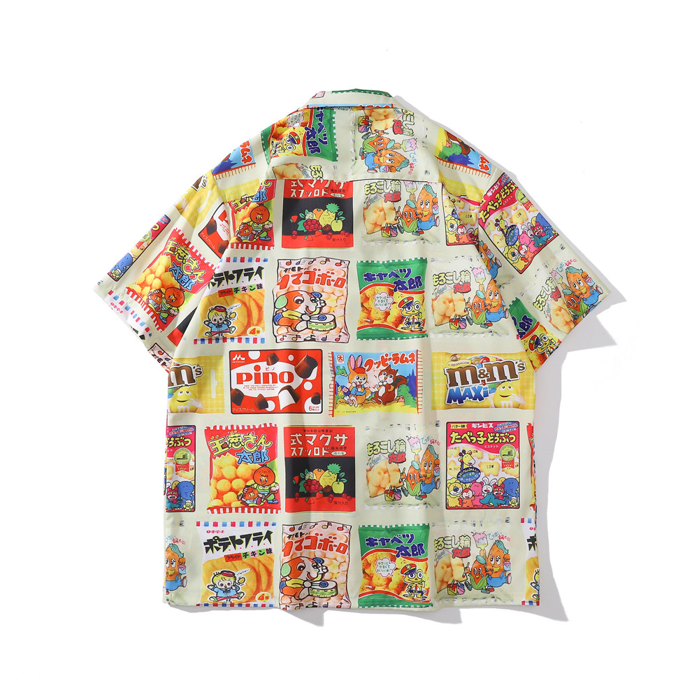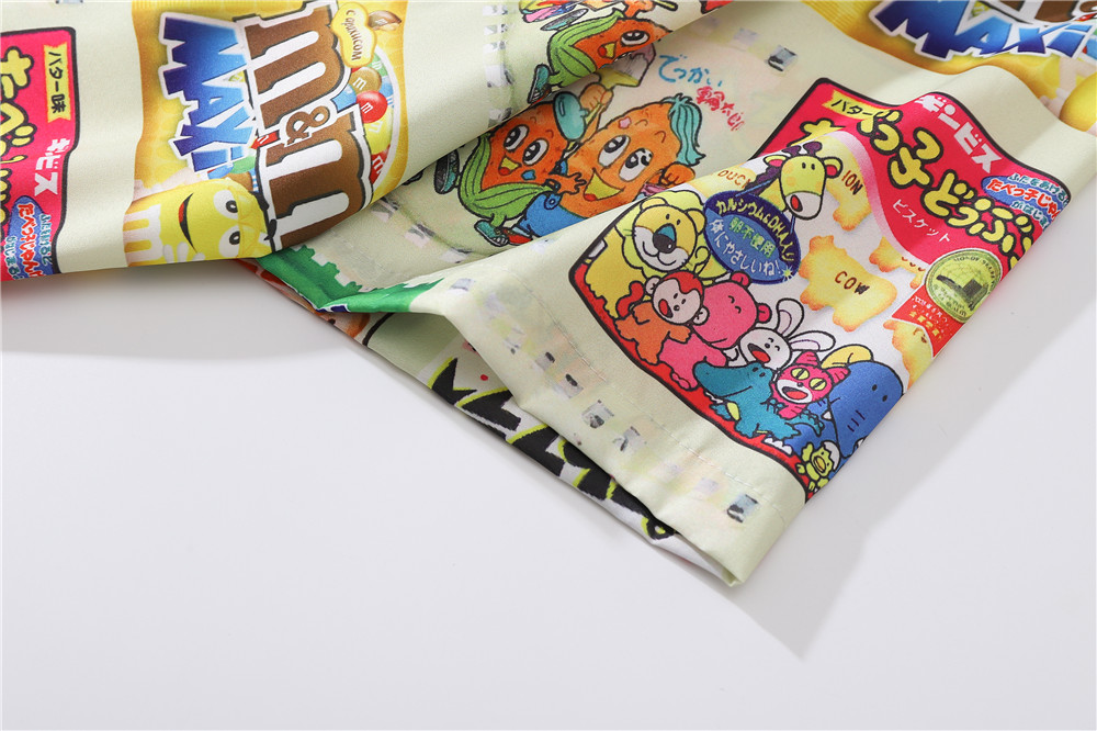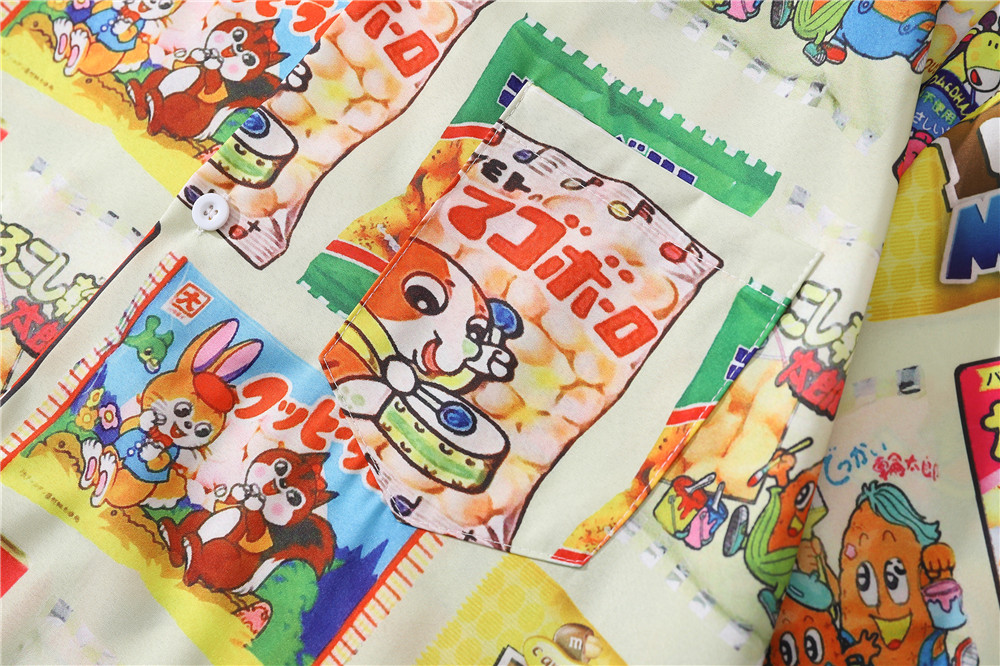 Cute short-sleeved blouse with a pocket on the chest and allover Japanese snack pattern.