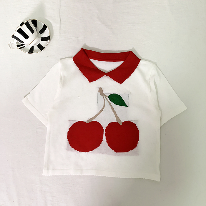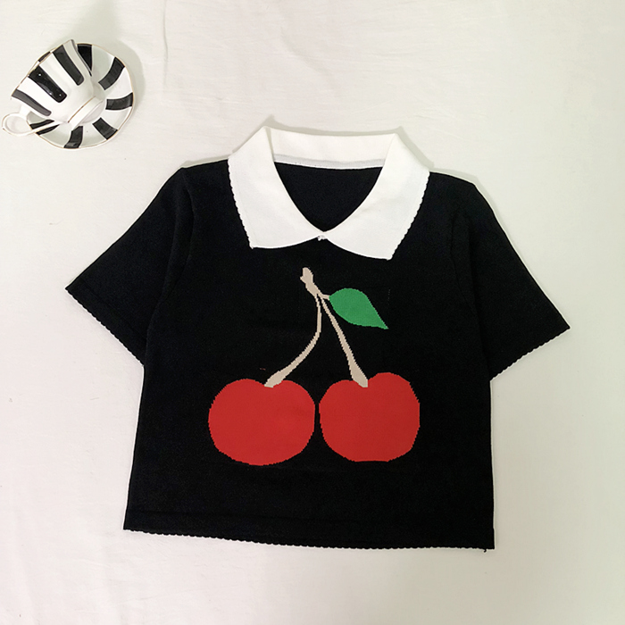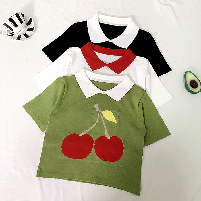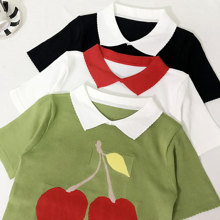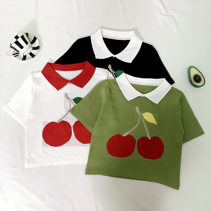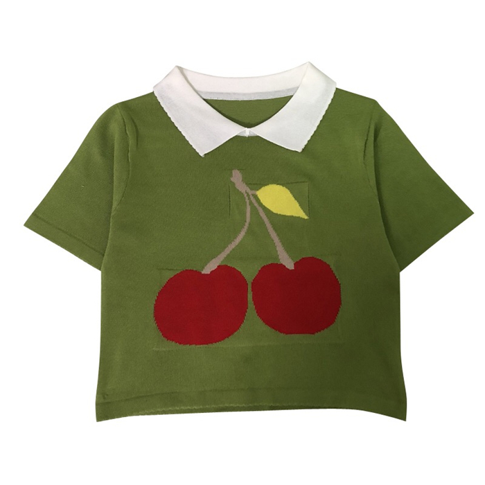 Vintage style knitted collared polo top with short sleeves and retro cherry illustration, available in black, green and white.