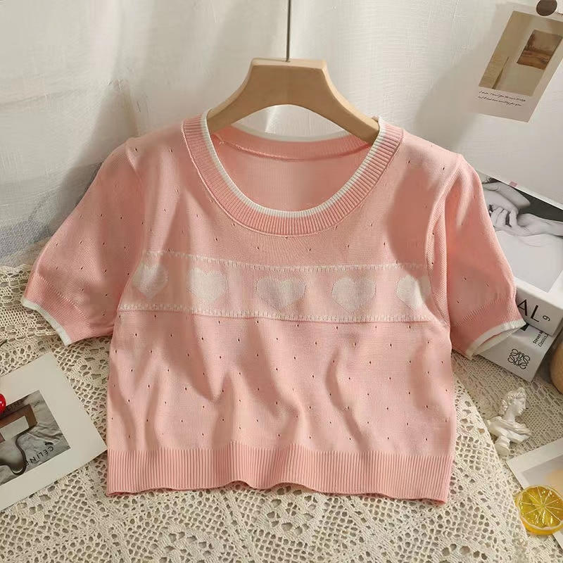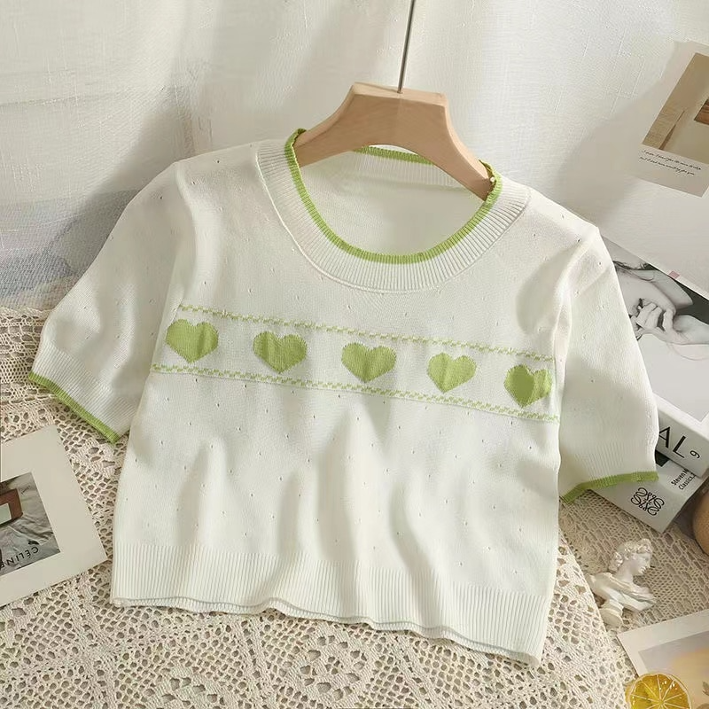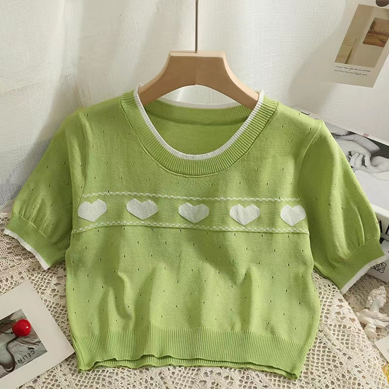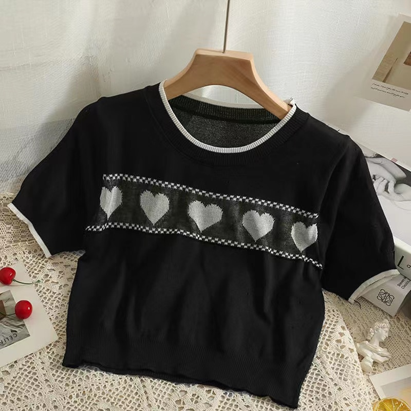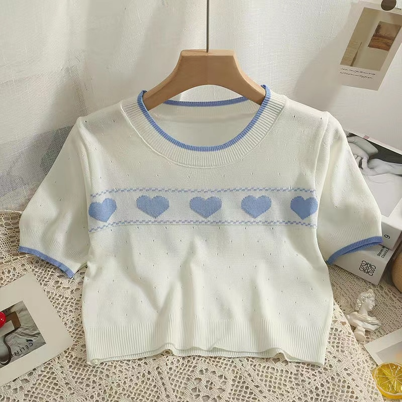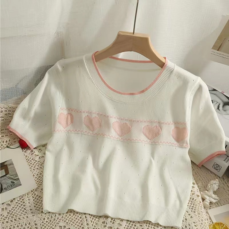 Y2k style knitted short-sleeved top with contrast stripes on the cuffs and heart border on the chest, available in 6 different colours.