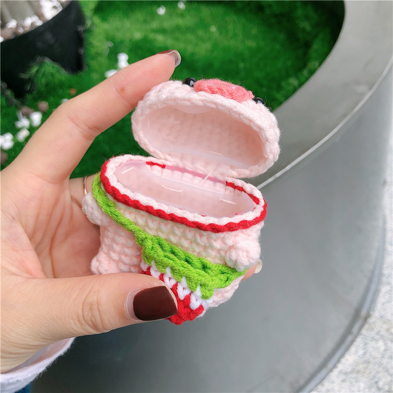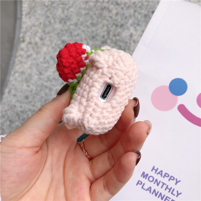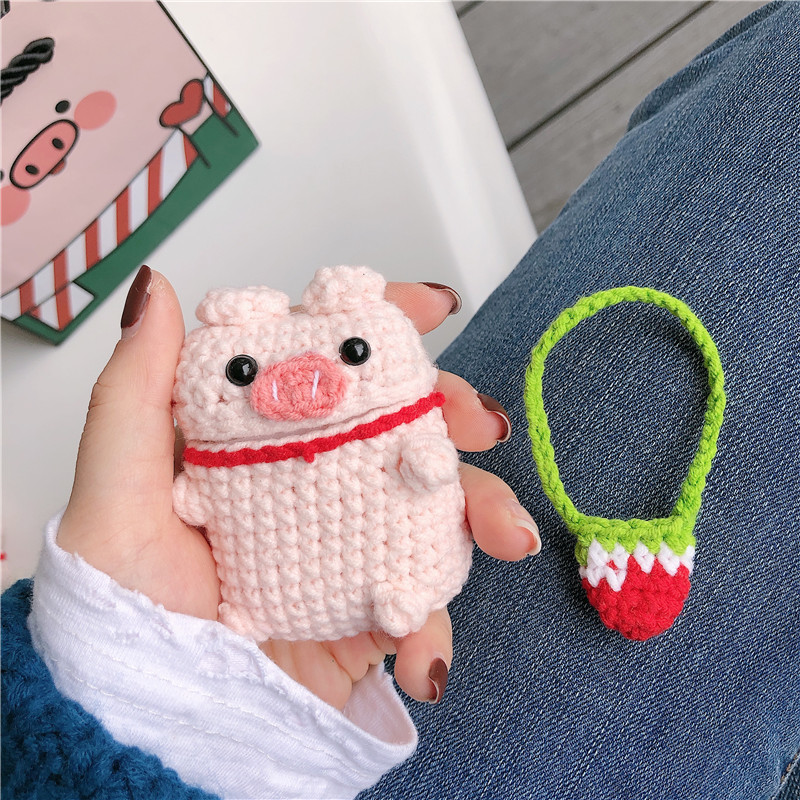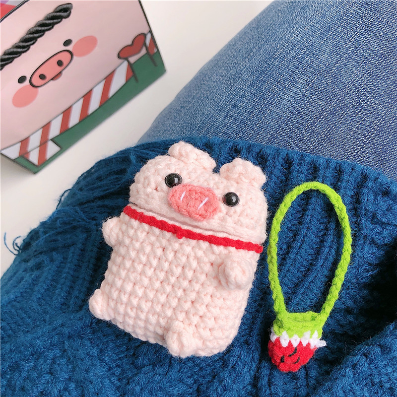 Cute soft protective cover for Airpod cases (Airpod charger case not included!), shaped like a little crochet pig with a little red and green knitted strawberry purse! Will fit Airpods pro and Airpods 1/2