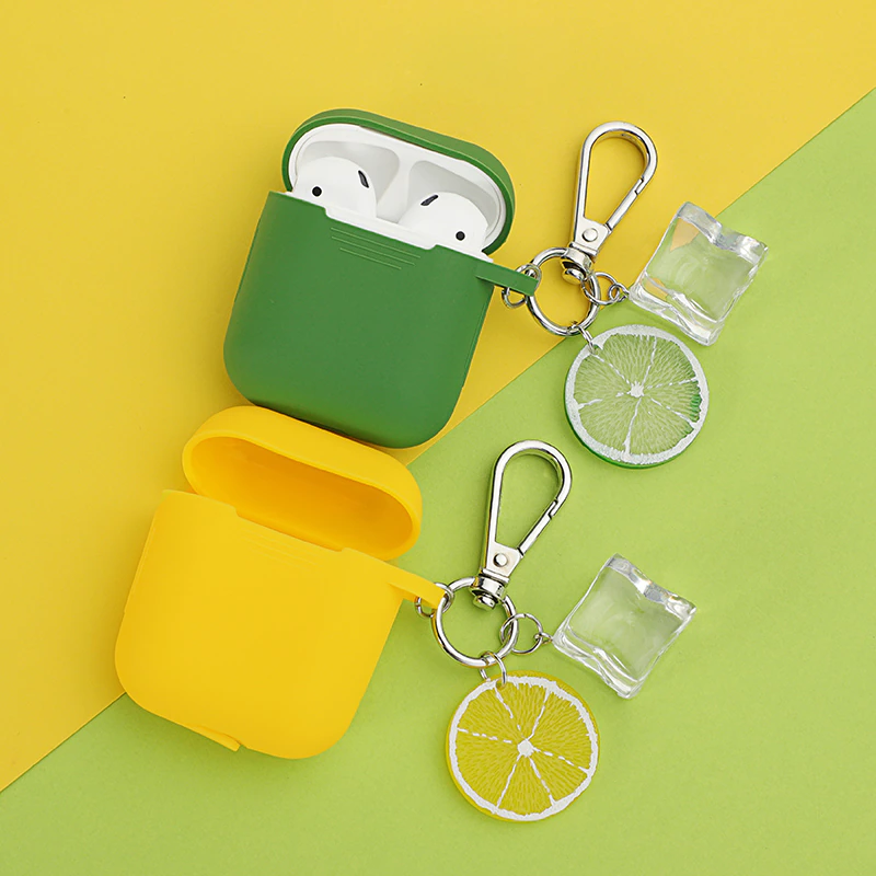 Cute soft protective cover for Airpod cases (Airpod charger case not included!) with a decorative clasp featuring a slice of lemon or lime and an ice cube. Available in two different designs!