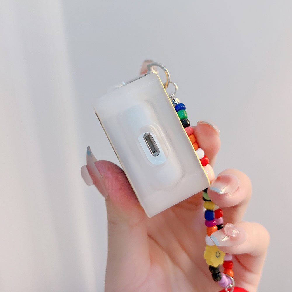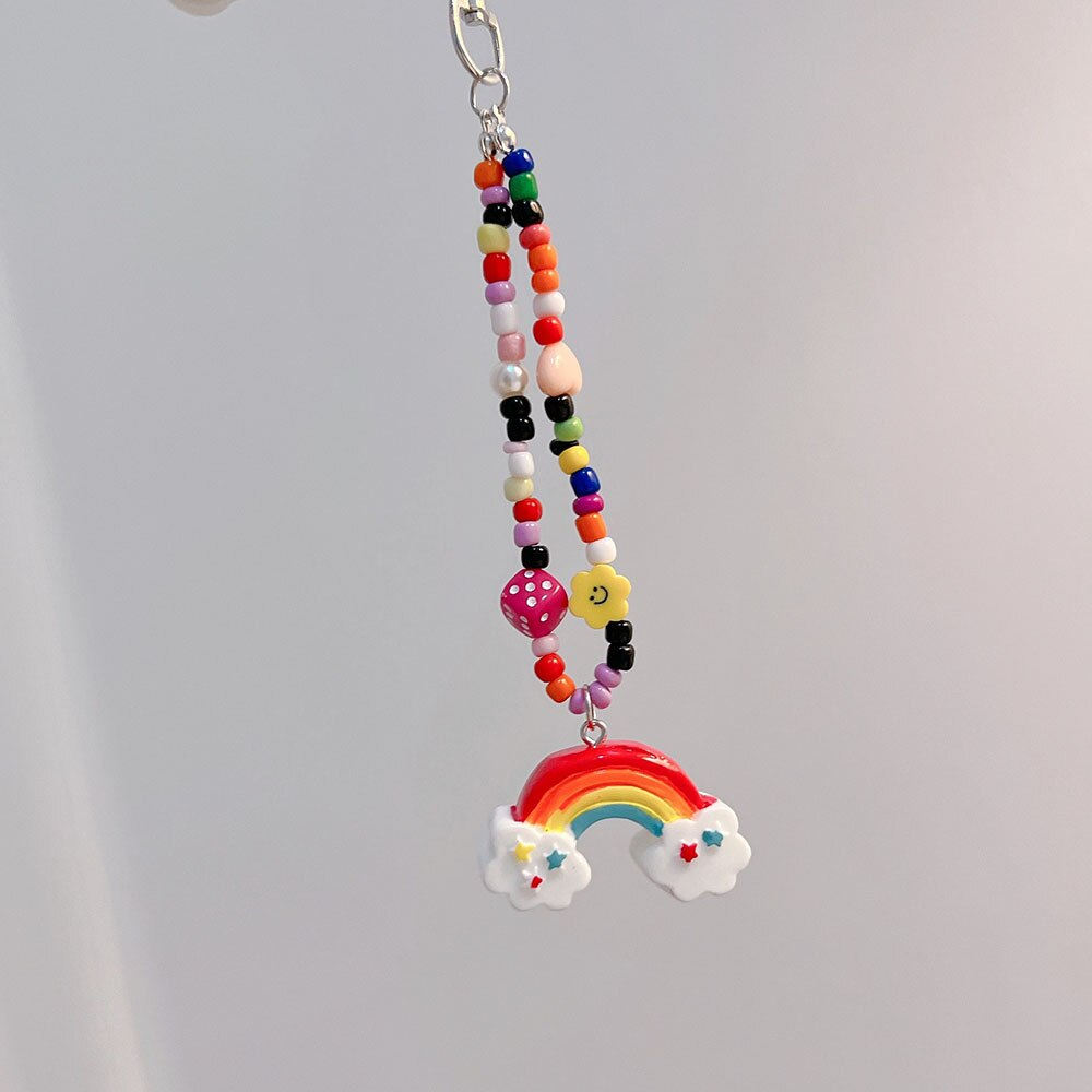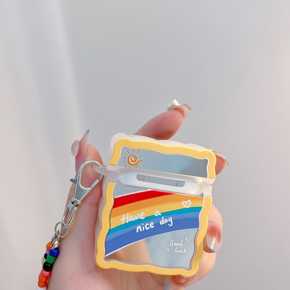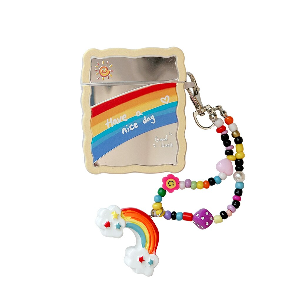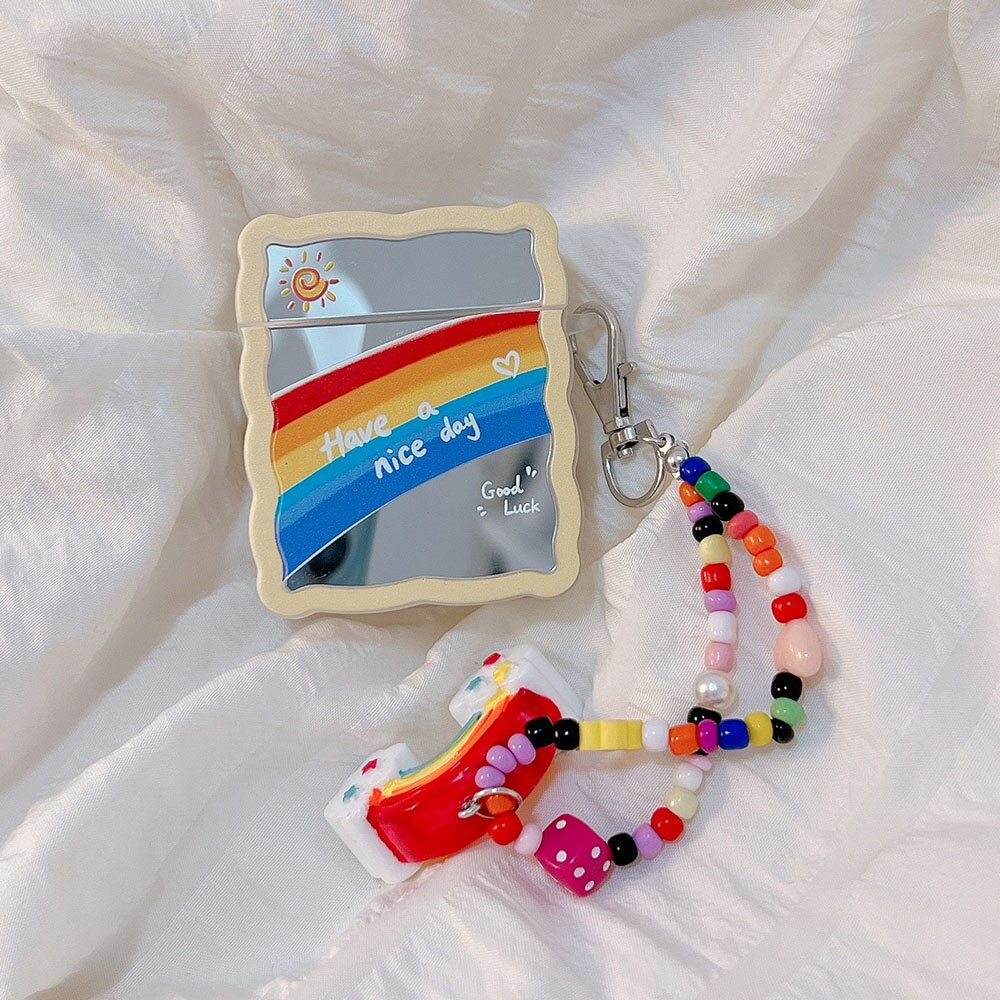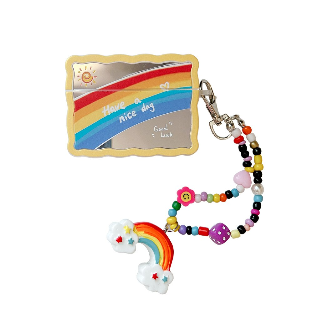 Cute protective cover for AirPods charger cases (AirPods charger case not included!) with silver mirrored surface, rainbow design and "Have a nice day" lettering! Case has a beaded clasp strap with rainbow charm.