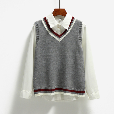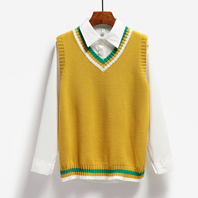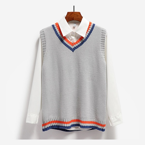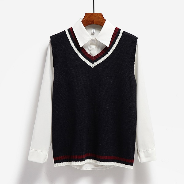 Fitted knit vest with contrast stripe detail (blouse not included!), available in five different colours.
