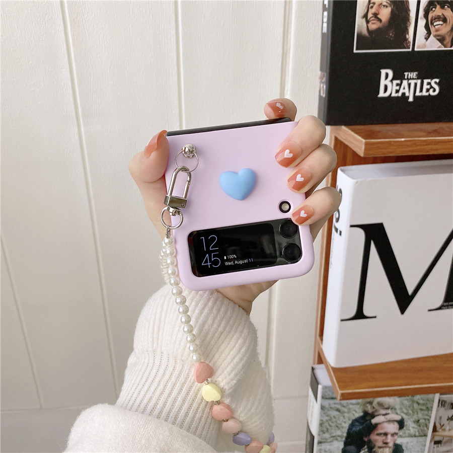 Pastel foldable phone case for Samsung Galaxy Z Flip phones with cute heart decals and faux pearl wrist strap, available in six different colours for Z Flip 3 phones.
