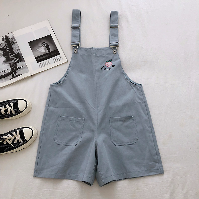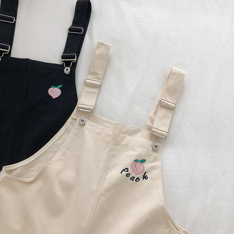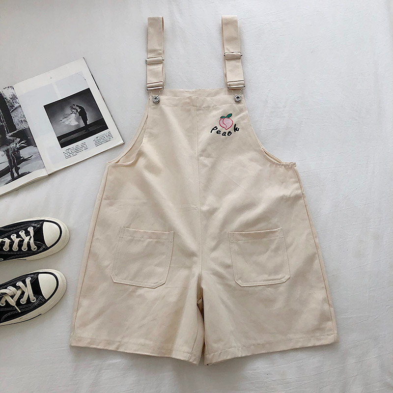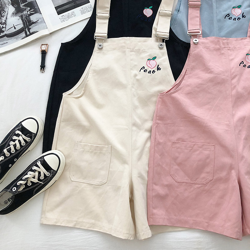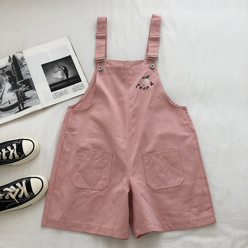 Cute overall/dungaree shorts with front and back pockets and embroidered peach detail on the chest, available in four different colours.