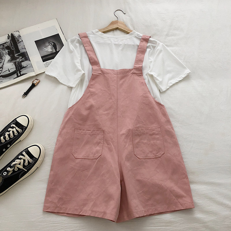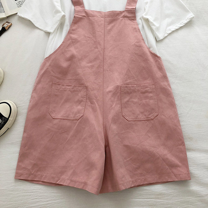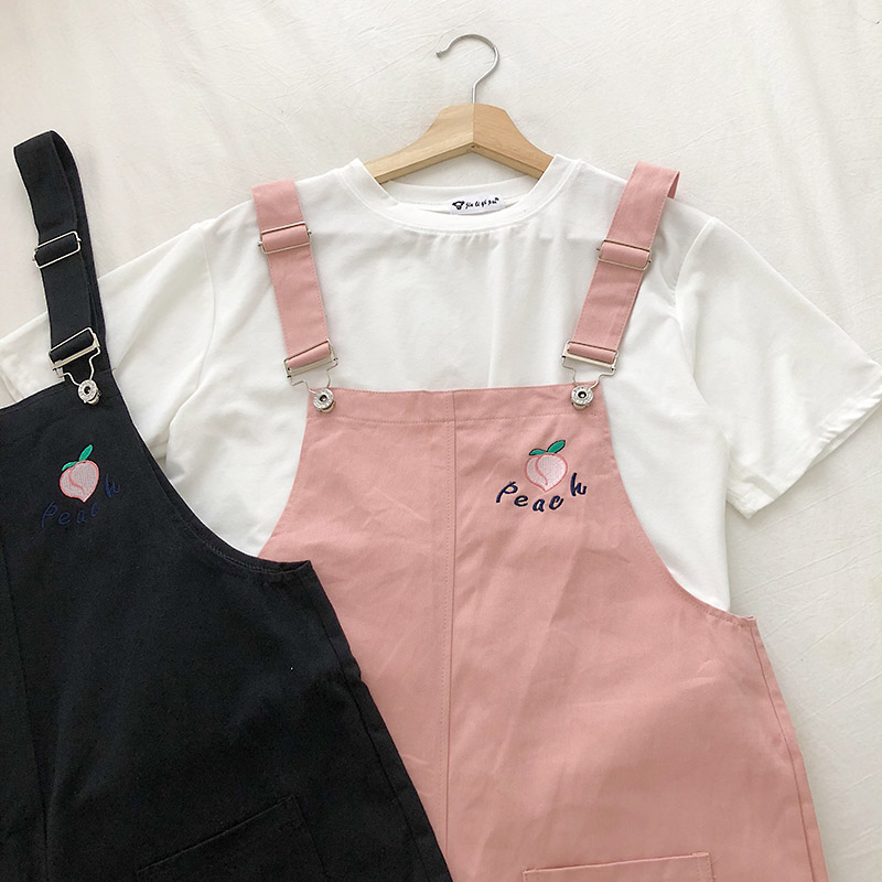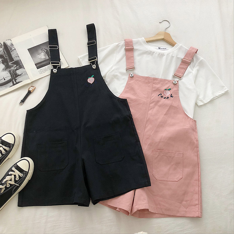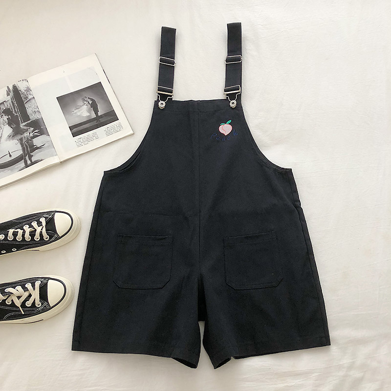 Cute overall/dungaree shorts with front and back pockets and embroidered peach detail on the chest, available in four different colours.