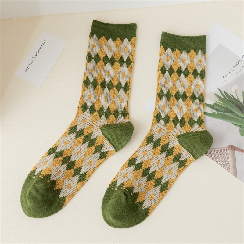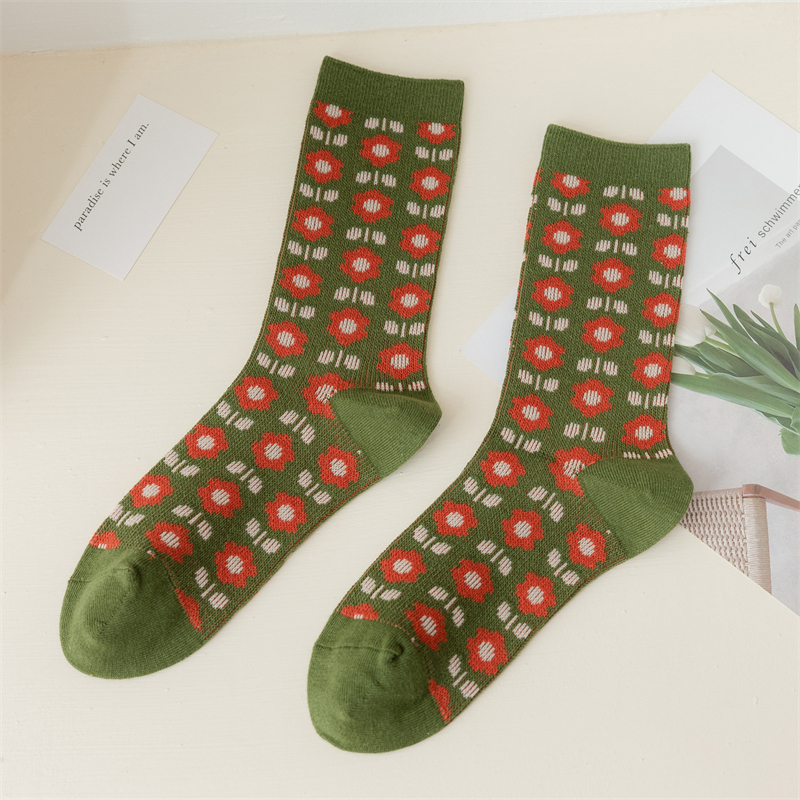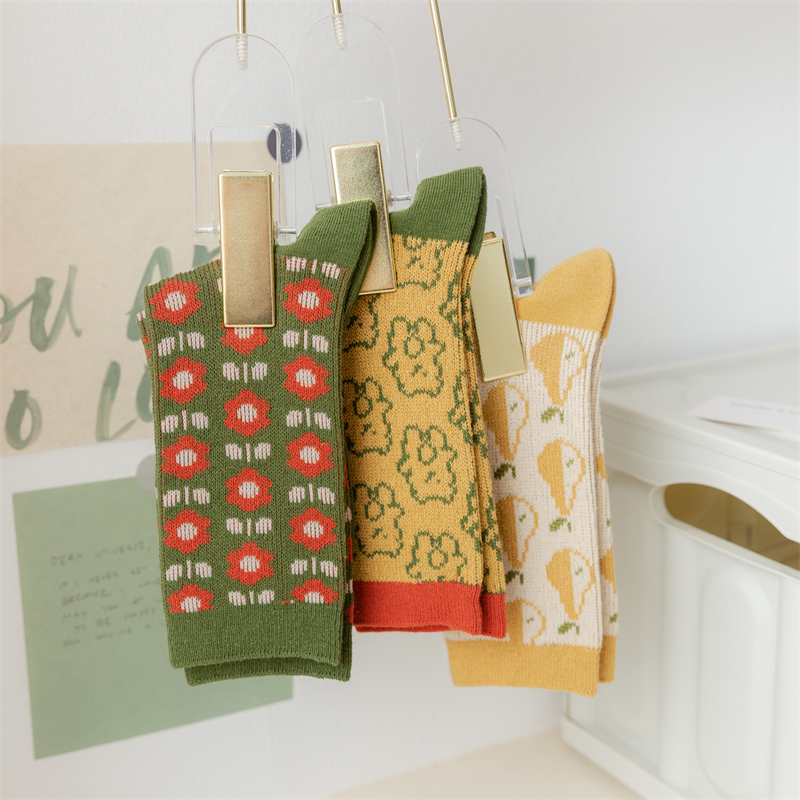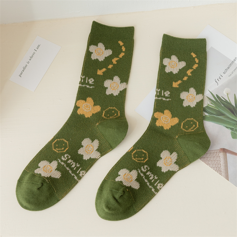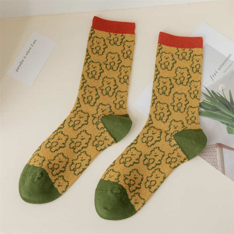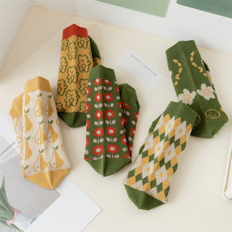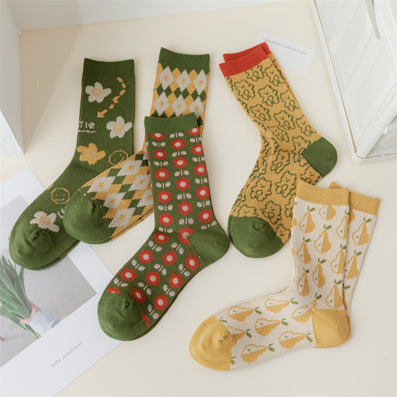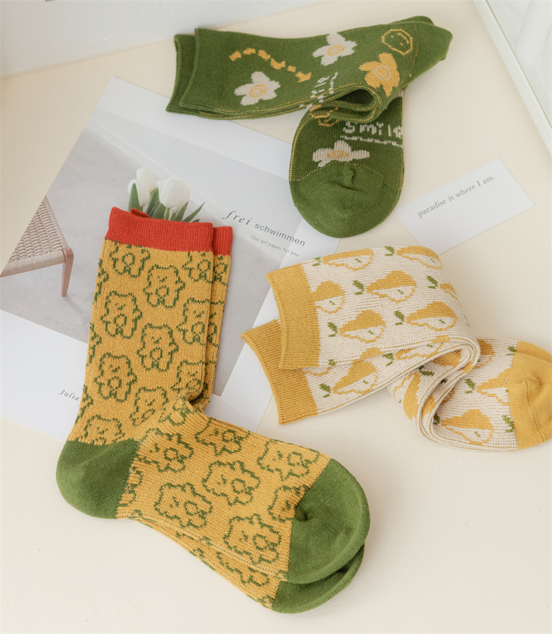 Cute mustard and green socks with animal, flower, and fruit patterns! Available in six different designs, will fit up to a size EU39.